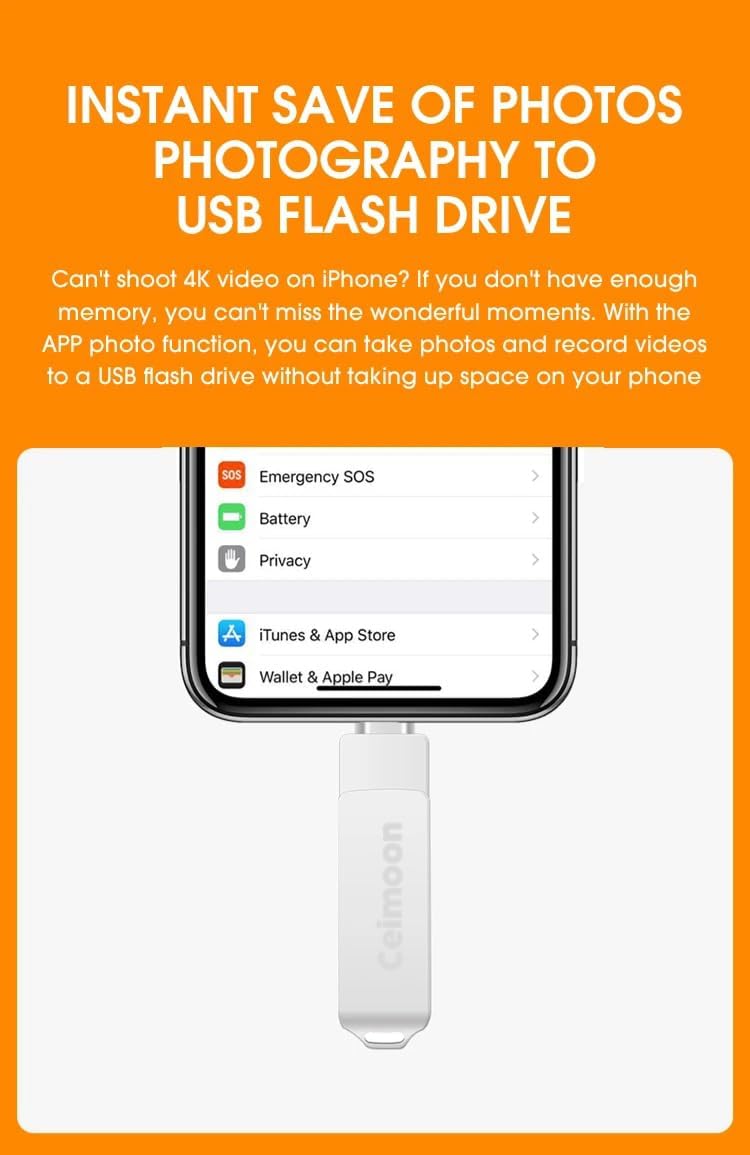💪 STRONG; The CEIMOON Android and iPhone flash drive features rock solid design crafted from durable materials; This iPhone memory stick is designed to be super tough and withstand everyday use.