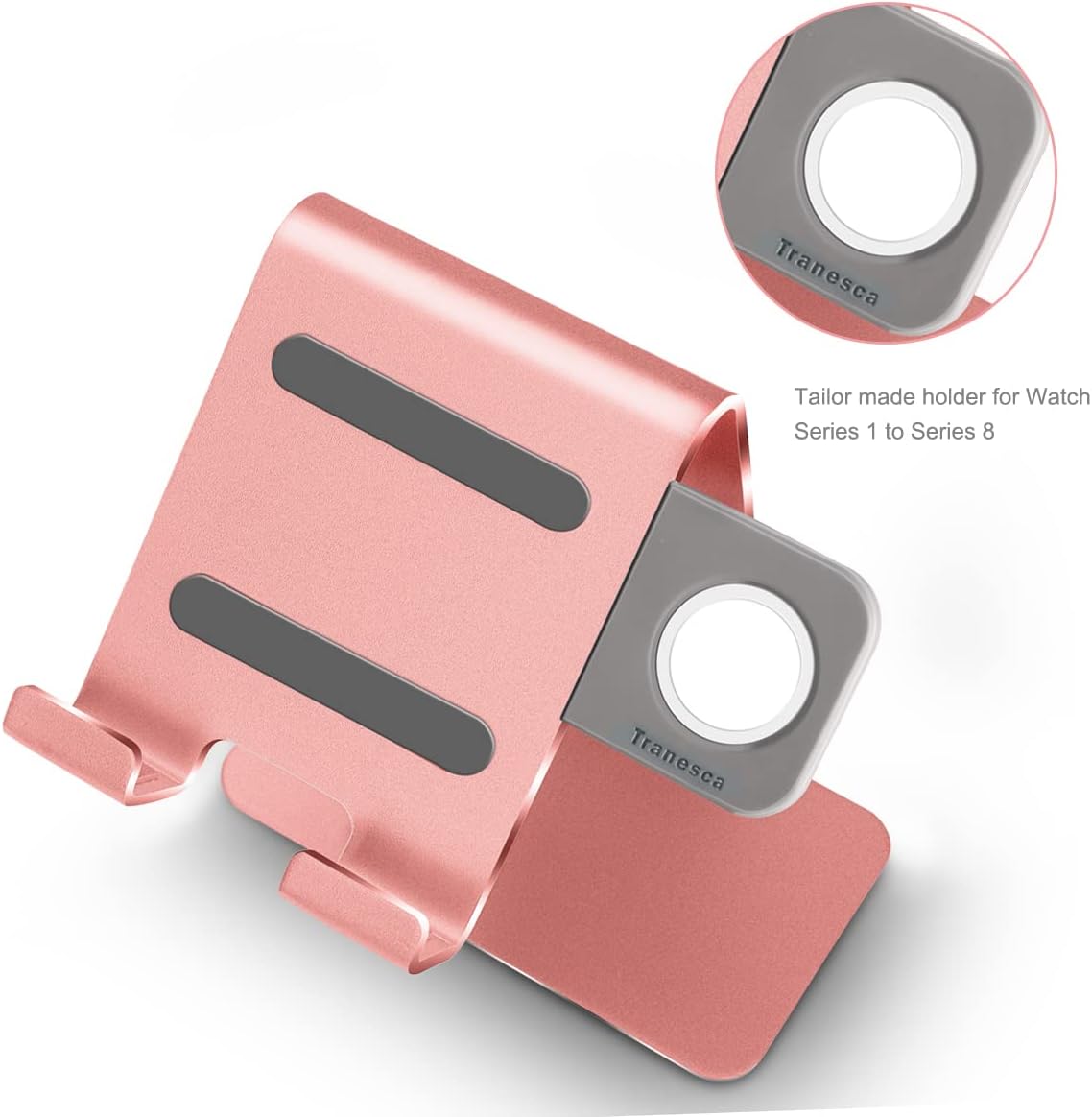 Rose gold aluminum holder stand for Apple Watch Ultra2/Ultra/10/9/8/7/6/5/4/3/2/1/SE and Cell Phone of all versions; Multifunctional and versatile, works as a charging stand/charging dock/charging station for Apple Watch and iPhone (iPhone 15 Pro Max/15 Pro/15 Plus/15/14 Pro Max/14 Pro/14 Plus/14 /13 Pro Max/13 Pro/13/13 mini/12 Pro Max/12 Pro/12/12 mini/11 Pro Max/11Pro/11/, iPhone SE (2nd generation), iPhone XS MAX/ XS, iPhone XR/X, iPhone 8 Plus/8, 7 Plus/7, 6 Plus/6/5and tablets; Also works with most Android phones and tablets, E-readers (Kindle), video games consoles; Buy one and find a home for all three