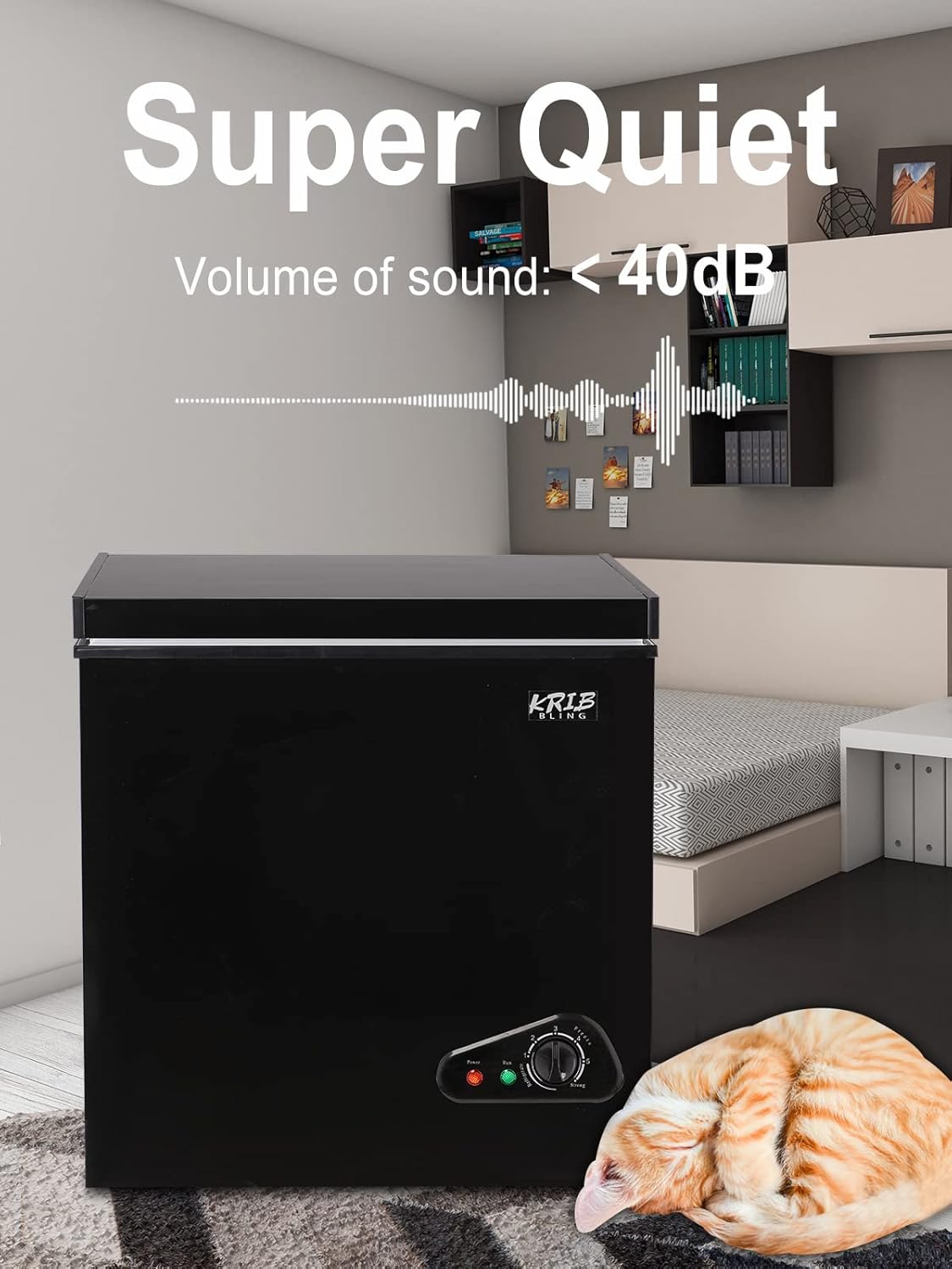 🍧 Whisper-quiet: While the compressor is working so hard, the noise level won’t be so high, only 38 dB, which is totally tolerable and won’t affect you doing anything. And it’s also pretty energy-saving, our Krib Bling chest freezer won’t cost much during its usage.