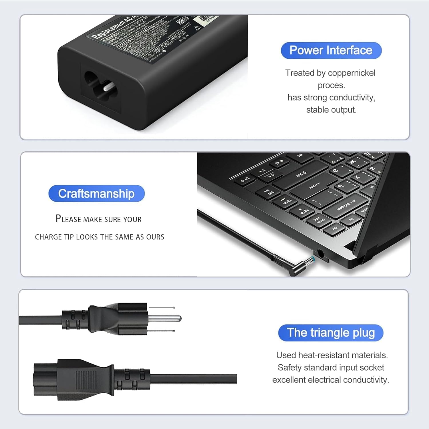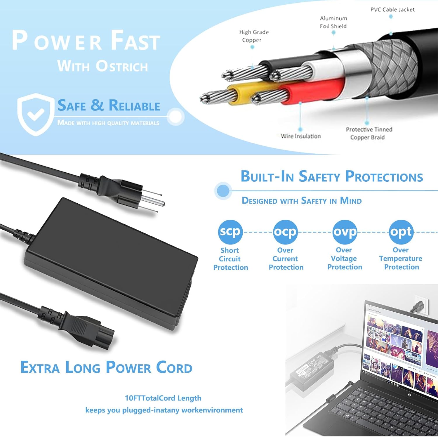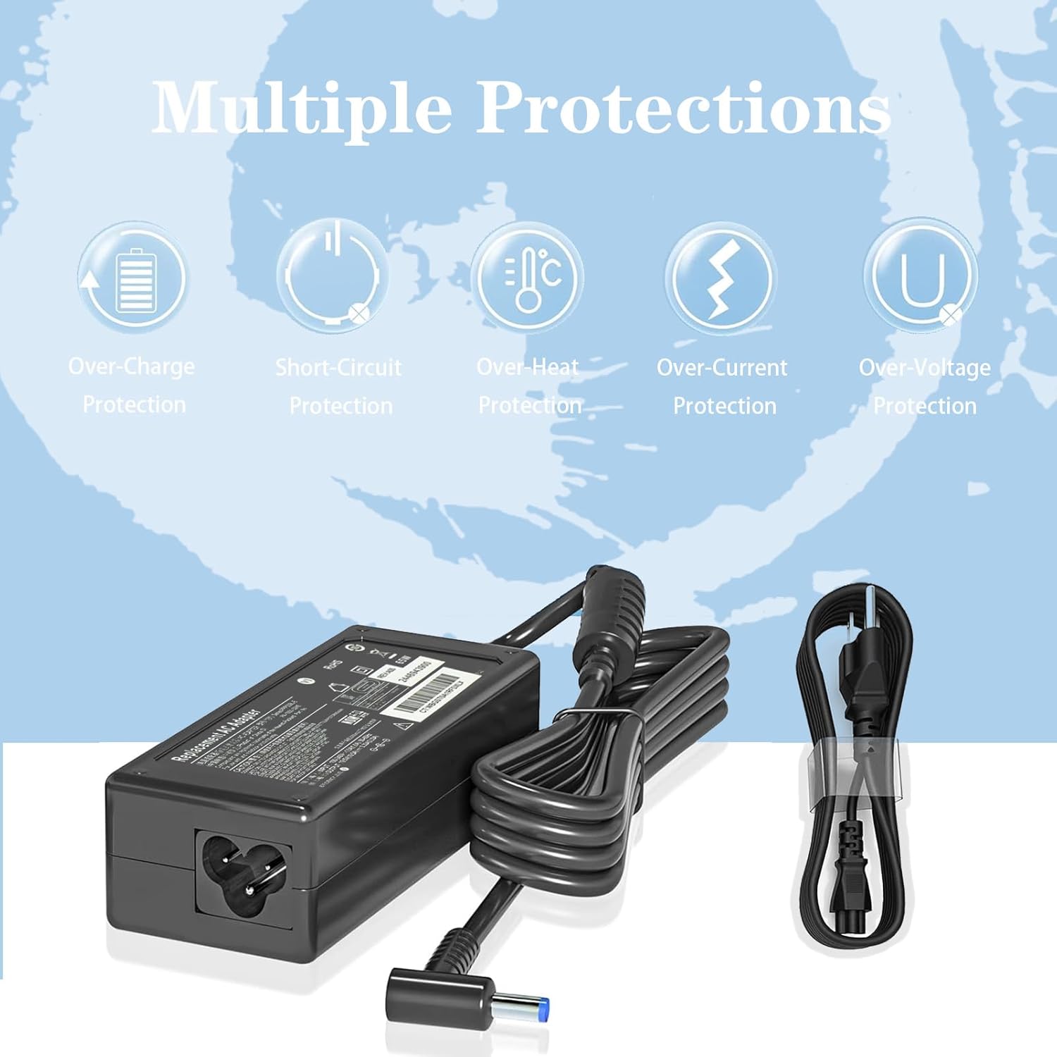 This 65W Laptop charger owns a built-in Multiple protection system, avoiding over-voltage, over-charge, over-heat, etc.