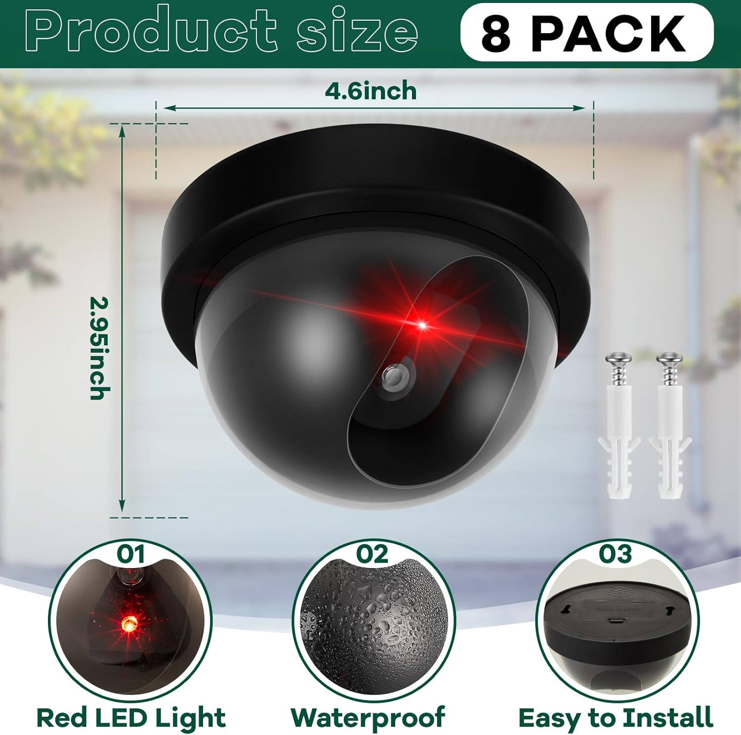 Easy Installation and Versatile Placement: with the included screws and tape, these wireless fake outdoor cameras can be effortlessly installed both indoors and outdoors; The base diameter of 4.61 inches and height of 2.95 inches makes them compact and easy to position discreetly in any desired location