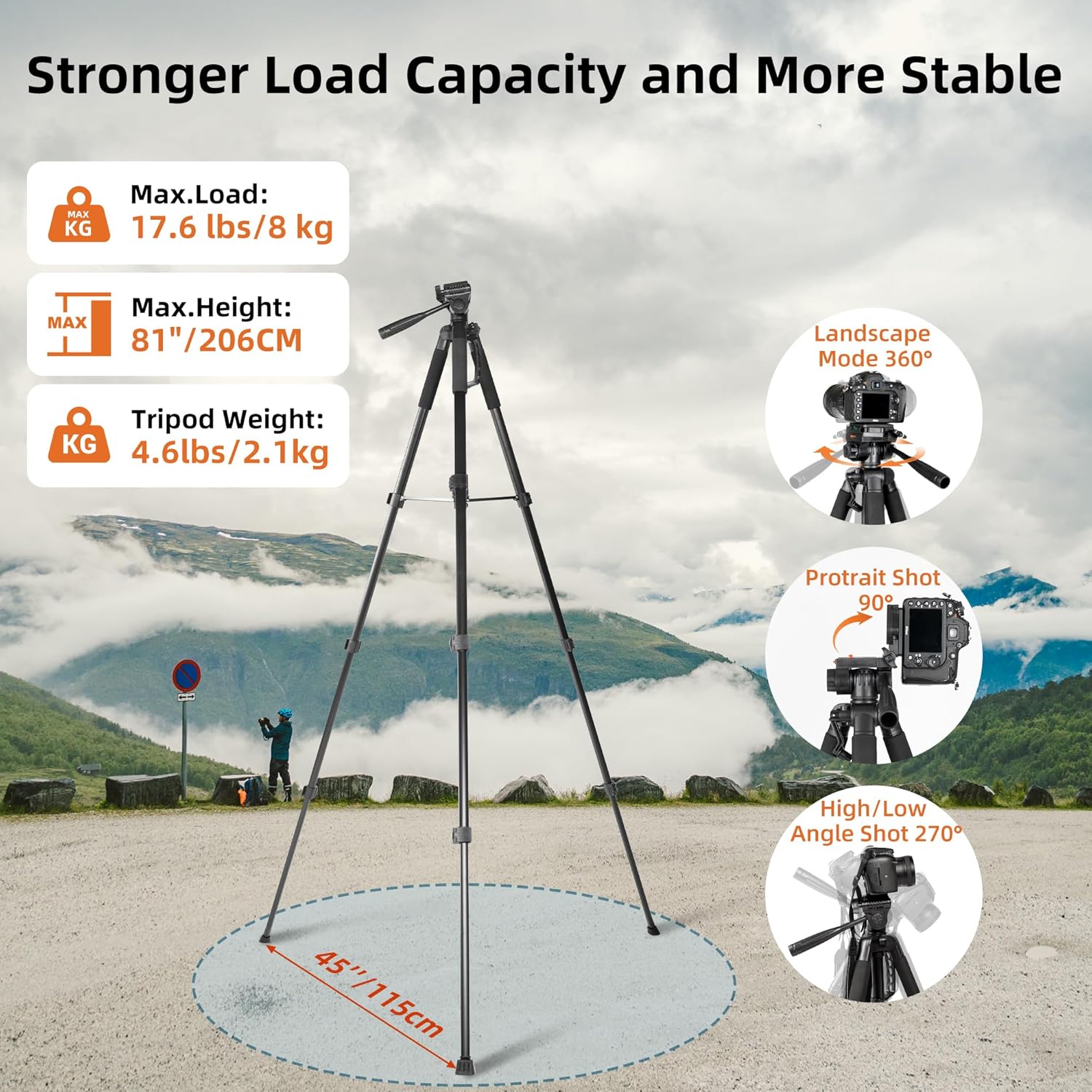 【81″ Camera Tripod】GCJUYA upgraded tripod for camera combines high quality aluminium iron alloy materials, the tall camera tripod can be extended from 23 to 81 inches and square tube width widened to 1.06 inches, max load is 17.6lb. provides super stability and stronger load capacity. In addition, the 3-flip pin lock allows you to easily extend the height of the tripod.