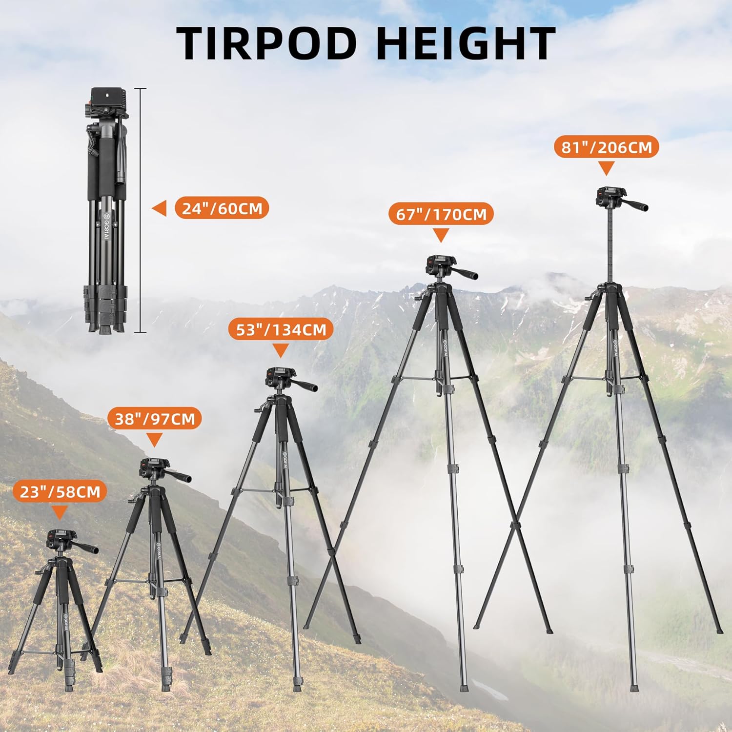 【3-Way Rotation Pan Head】The 3-way rotation pan head offers a versatile range of angles, supports 360° landscape mode shooting, 90° panorama mode shooting, supports 270° high and low angle shooting, allowing you to shoot photos from different angles, when you use pan and tilt when taking photos or videos, the camera tripod stand can provide excellent stability and give you excellent, smooth results.