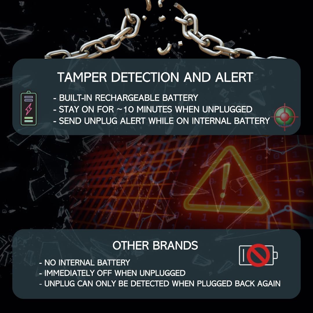 Our trackers come with internal battery and can send unplug alert in real-time when unplugged (without a built-in battery it would instantly die when unplugged and can only send unplug alert when it’s being plugged back again).