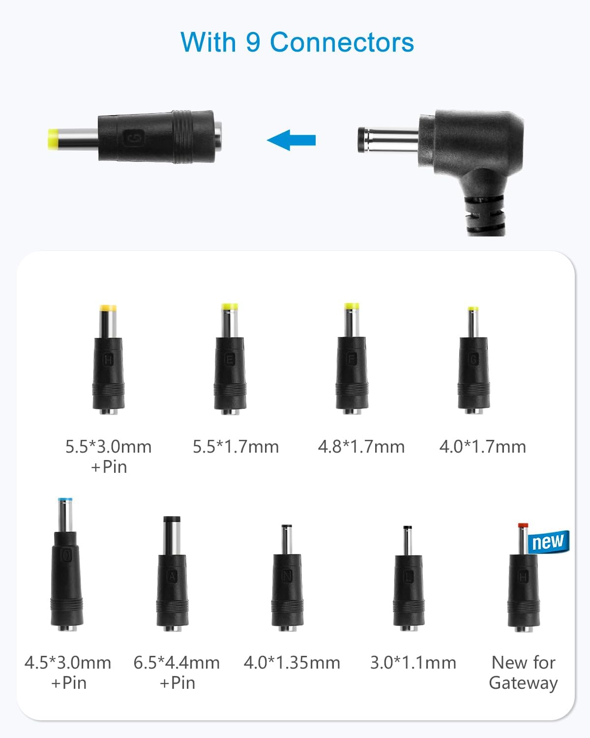 DC Connector size: External Diameter: 5.5mm, Internal Diameter: 2.5mm. Comes with 9 extra DC Barrel Plugs: 6.5*4.4 mm, 5.0*3.0 mm, 5.0*1.7 mm, 4.8*1.7 mm, 4.5*3.0 mm, 4.0*1.7 mm, 4.0*1.35 mm, 3.0*1.0 mm, new tip for Gateway. (Feel free to contact us if you are unsure whether any of these are suitable for your device.)