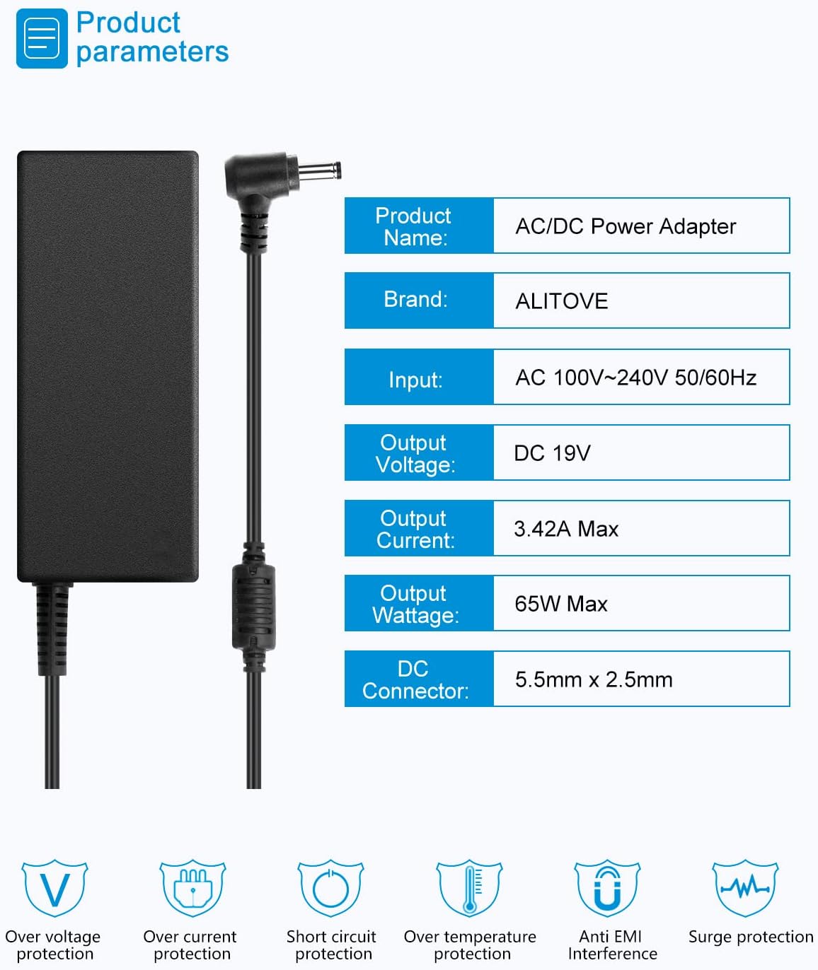 100% Brand New, DC-Output : 19V~3.42A~65W; AC-Input: 100~240V 50/60 Hz. Works with devices that require input current/amperage lower than 3.42A,such as 1.58A 1.6A 1.75A 1.89A 2.0A 2.1A 2.2A 2.31A 2.37A 2.53A 2.63A 3A 3.15A 3.16A 3.4A 3.42A,etc.(Note:the Maximun Output is 19V 65W)