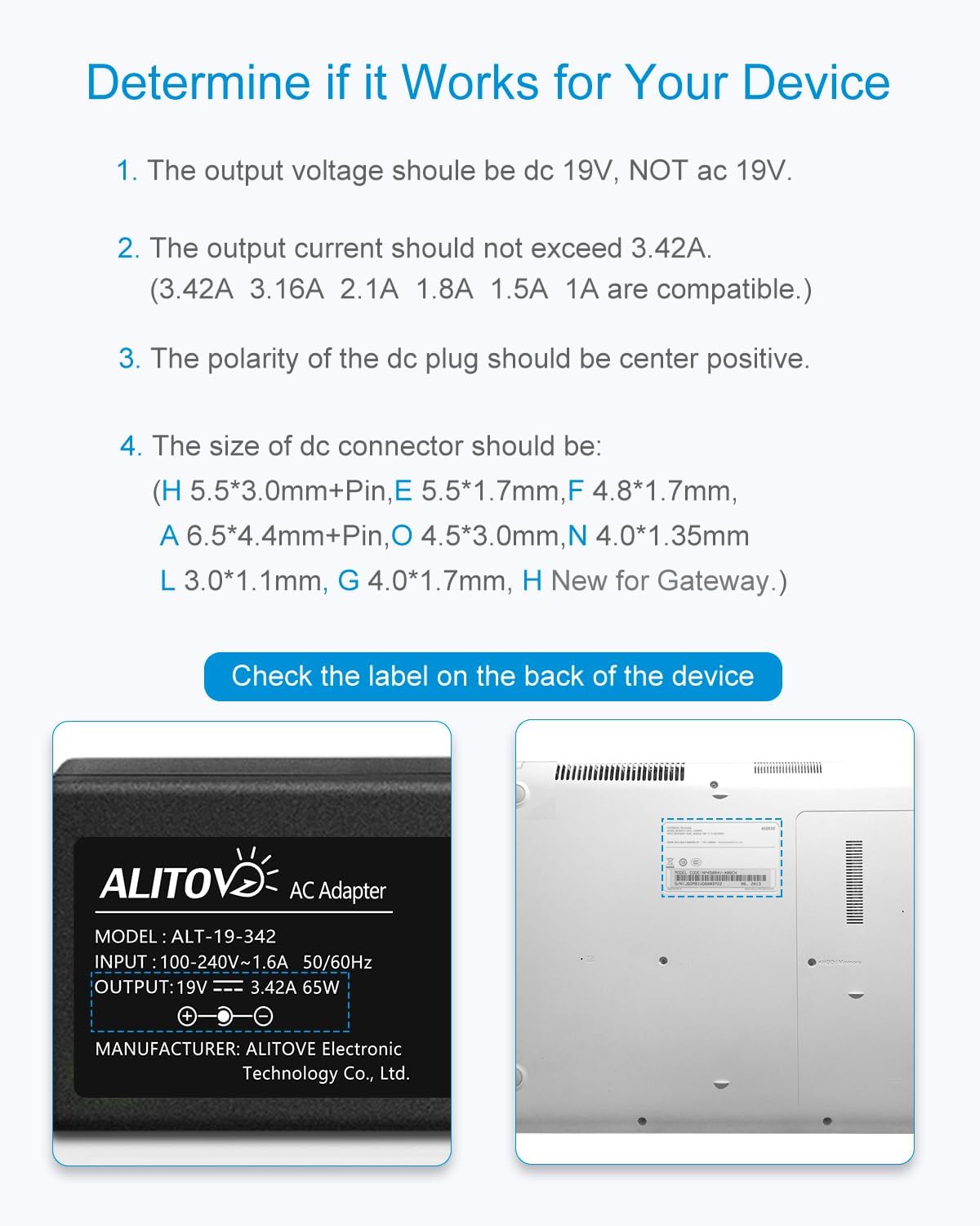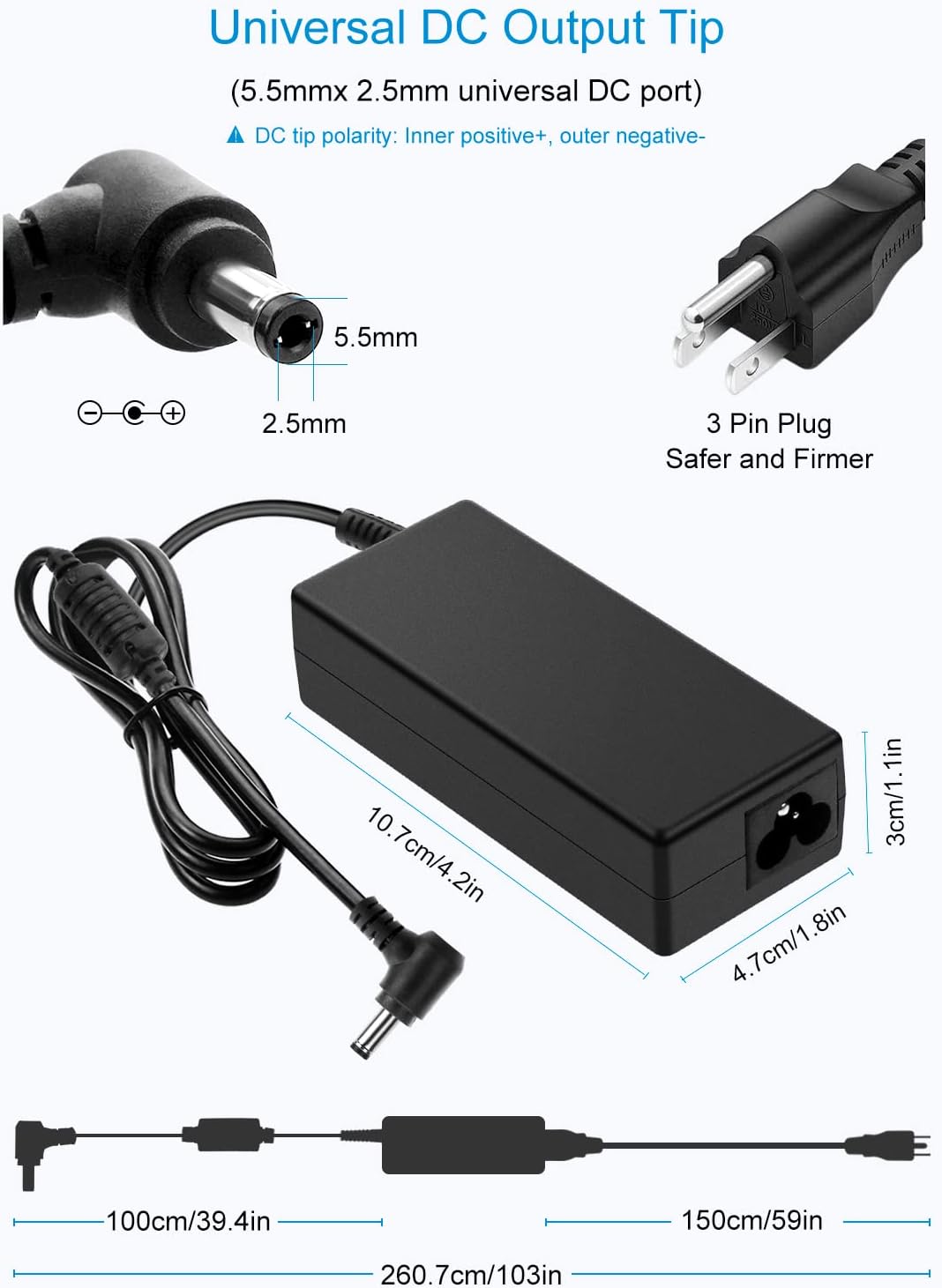 Input: AC 100V~240V 50/60Hz Output Voltage: DC 19V ( constant voltage ) Output Current: Max 3.42A Output Wattage: Max 65W Length: in the picture below the title DC connector: 5.5mm x 2.5mm (inside”+”, outside”-“) Safety Compliance: FCC / CE/ RoHSPackage List: 1x 19V 3.42A power supply adapter; 1x 1.5M AC input power cable; 9x DC tips.Kindly noteDC Plug Polarity: inner positive(+), outer negative(-). It is not compatible with all Devices. Some musical device requires inner negative and outer positive (totally opposite), please check carefully before buying.The power adapter is not waterproof, please don’t use it outdoor. Please keep it away from water and fire. If there is any problem with the power supply, please feel free to Let us know anytime. We will solve the problems for you within 12 hours.