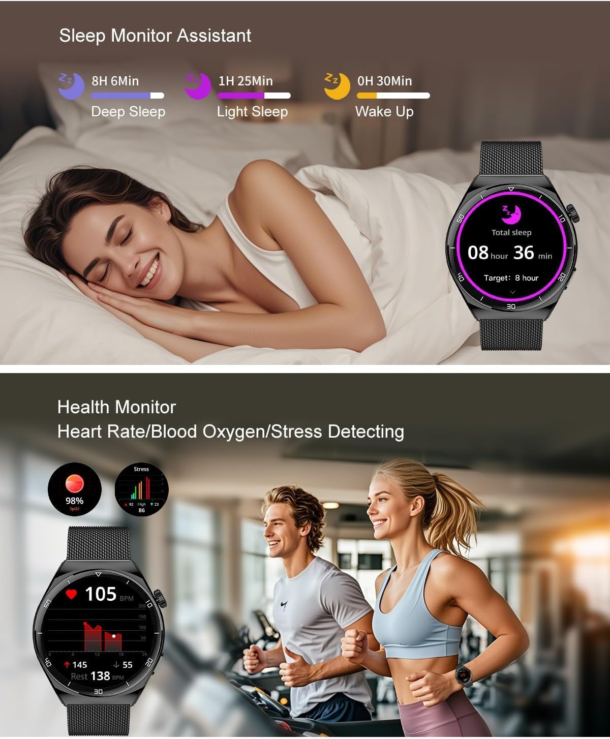 【Elegant and Stylish Smartwach 】This smartwatch is a round dial design, elegant and stylish, suitable for men and women. The smartwatch has 3 straps to choose from, leather, silicone, stainless steel, cater to different occasions and styles.