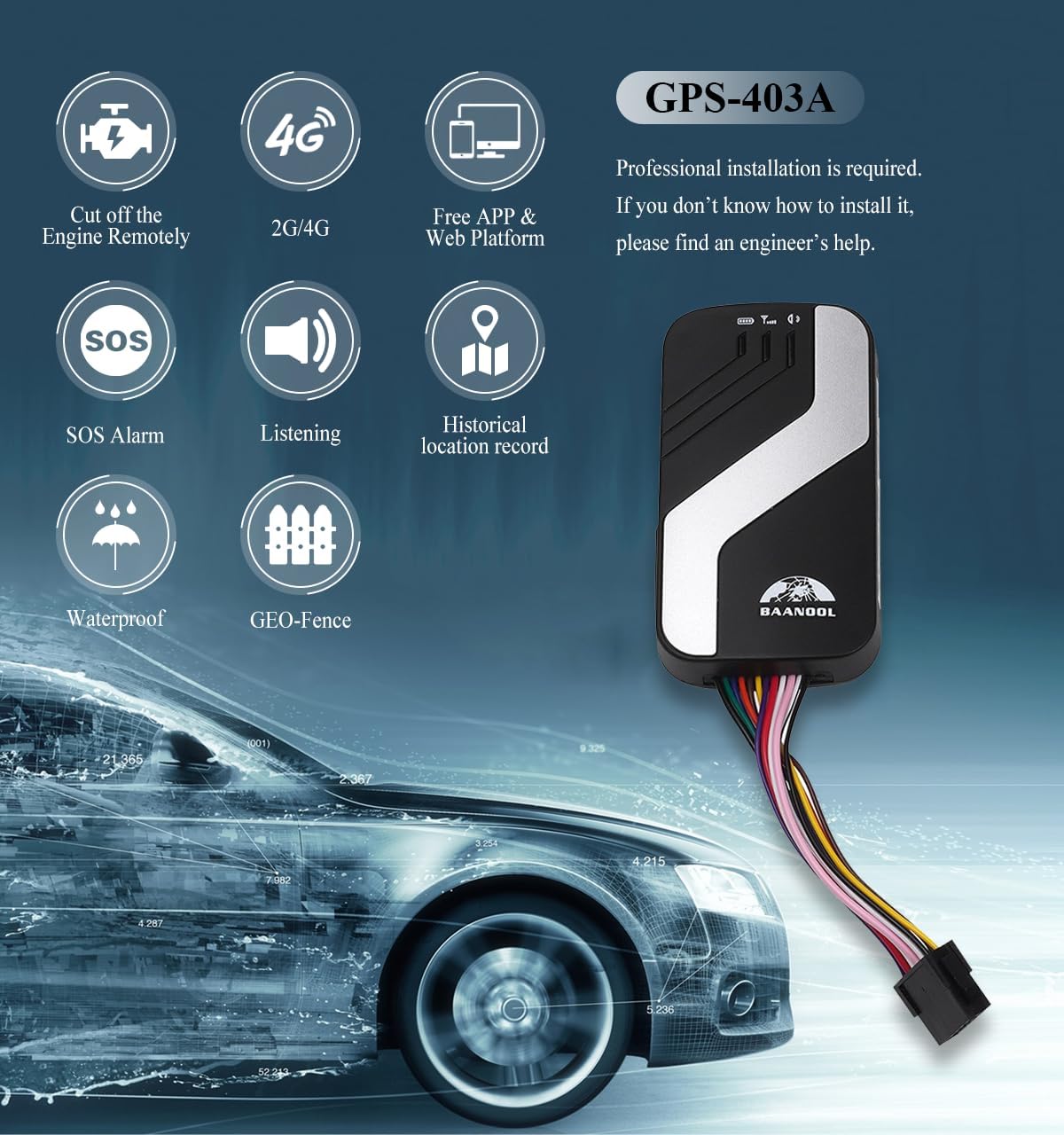 [Compatibility]: You’ll need to buy a SIM card to use this trackers. TK403 A/B GPS tracker for vehicles should be installed to the on-board power supply. It’s compatible with various fuel cars. Car Automobile 403 A/B GPS tracker supports 2G/4G network. Please download the APP (BAANOOL IOT) on Apple Store or Google Play.