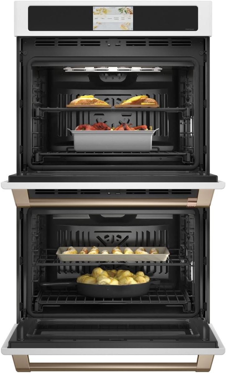 This Café Double Wall Oven celebrates style and performance with curated details that make cooking for a crowd a total delight. No Preheat Air Fry and a Dehydrate Setting give you new ways to deliver stunning results, and an In-oven Camera lets you monitor your food’s progress while you connect with family and friends outside the kitchen. Precision Cooking Modes and a temperature probe are your secret ingredients for every meal, guaranteeing exact results so you know each dish will be a crowd pleaser. When it comes to clean up, smooth-gliding racks can be left in the oven during the Self-Clean cycle and a Steam Clean option is perfect for wiping up messes after each meal. Plus, it comes in countless combinations of finishes and hardware, to create a look as unique as you are. Built-In WiFi, Powered by SmartHQ App Manage all aspects of your kitchen with the help of the SmartHQ App or your voice assistant (Select features require WiFi Connection) See details Personalized Features + Upgrades Usher in the latest features by downloading cooking upgrades right to your oven, putting Air Fry and more in your repertoire .a{fill:#5a4e46;} In-Oven Camera Check status from anywhere without opening the oven door with live streaming video of your food on your smartphone Watch Video .a{fill:#5a4e46;} Food Dehydrator Make homemade chips, spices and dehydrated fruits more easily than ever with a moisture-removing setting in your oven Watch Video .a{fill:#5a4e46;} Precision Cooking Modes Simplify the cooking process with precision cooking modes that automatically track progress, and make time and temperature adjustments Watch Video Brighten up life in the kitchen Easily navigate settings using a stunning full color display that adds an unexpected touch of style to your kitchen, including custom screen backgrounds and weather updates True European Convection with Direct Air This oven features True European Convection, an advanced convection system that uses a third heating element and reversing fan for the highest level of heat and air circulation No Preheat Eliminate the need for preheating and save time with a variety of precision cooking modes No Preheat Air Fry Cook healthier, crispier versions of your favorite foods in less time, thanks to an air fryer right in your oven that doesn’t require preheating, a basket or a special tray Easy-Glide, Never-Scrub Rack This smooth-gliding oven rack can be left in the oven during the self-clean cycle so you never have to scrub Fit Guarantee This oven will fit your existing cut-out, or GE Appliances will help pay for modifications up to $300 See offer criteria and details Self-Clean with Steam Clean This self-cleaning oven uses optional steam cleaning for light soils to clean the oven cavity with less heat and odor Temperature Probe A precision temperature probe connects to the oven to ensure your food is properly cooked In-Oven Broiling Broil in any size cookware with a flexible broiling element that goes the full width of the broiling drawer Soft-Close Door A soft-close oven door reduces noise and eliminates slams, for a more peaceful environment in the kitchen Customizable Finishes and Hardware Combinations Get a custom look in the kitchen by selecting your favorite hardware and finish combination. Choose from Matte White, Matte Black and Stainless Steel finishes, and Brushed Copper, Brushed Bronze, Brushed Black and Brushed Stainless hardware Wall-to-Wall Hidden Bake Element A hidden, 10-pass bake element heats a large cooking area evenly and allows for quick, easy cleanup