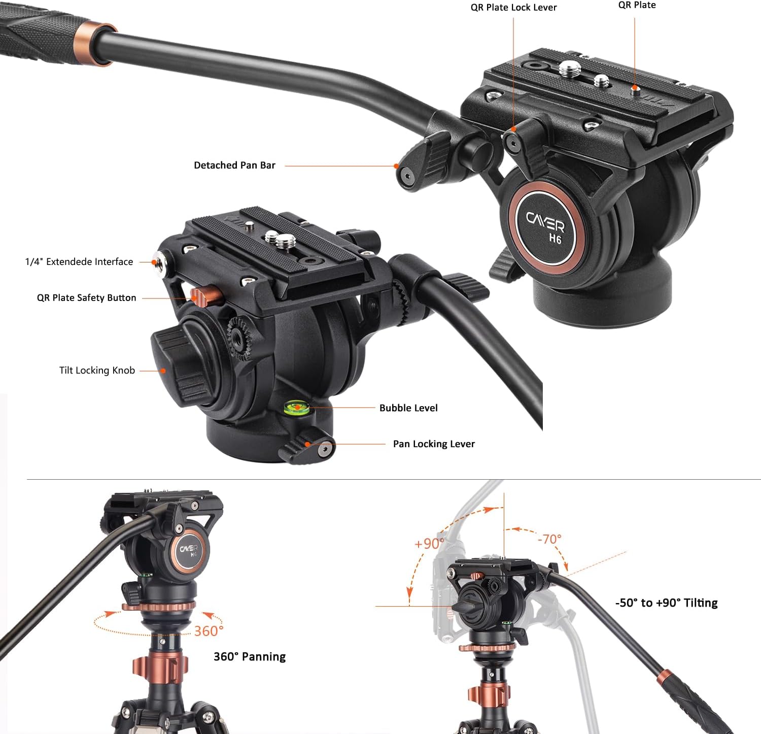 【Pan Tilt Head】: Features fixed counter balance, pan, and tilt drag with a fixed-length detached pan bar, offers 360° panning and +90° / -70° tilt; Integrated Flat Base with 3/8″-16 Thread