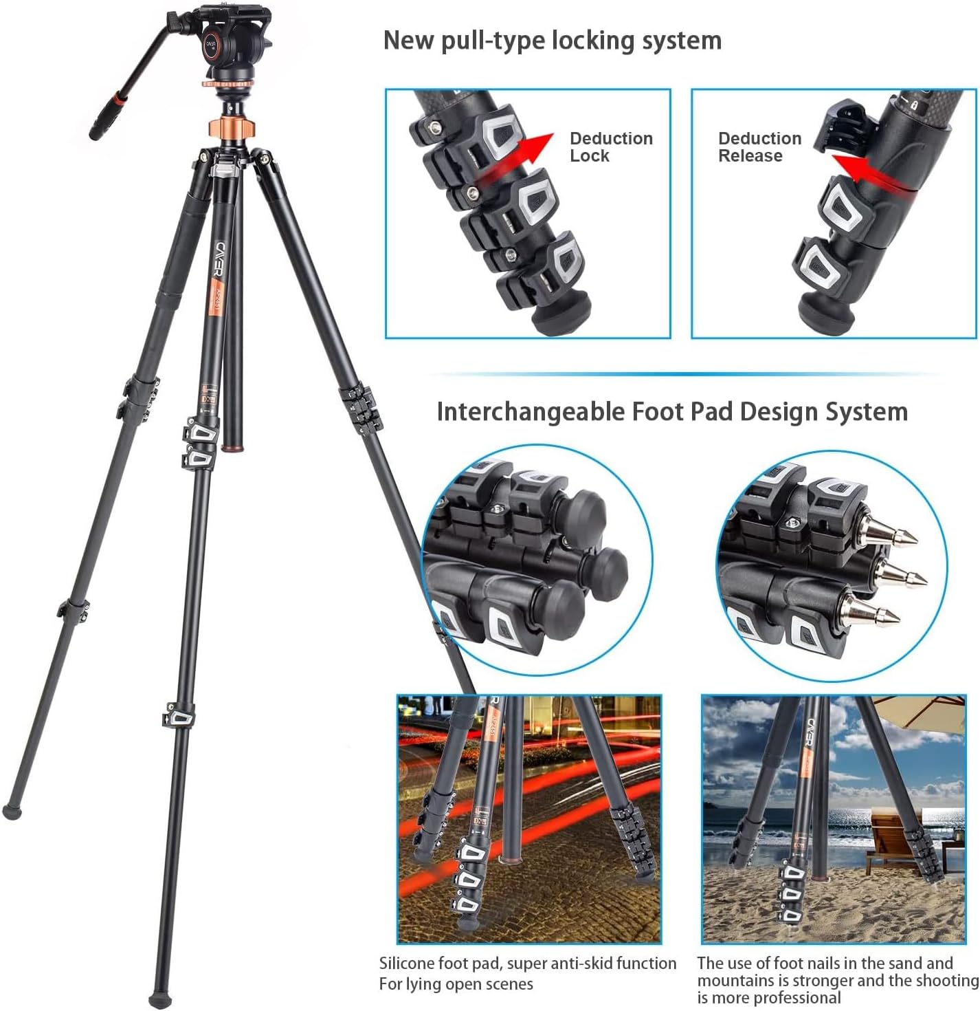 【Specifications】: 13.2 lb Load Capacity | 25.8″ to 74.6″ Height Range | Tilt Angle +90° / -70° | 360° Panning | 60mm Ball Diameter | Carrying Bag | Fluid Head | Tripod Leg