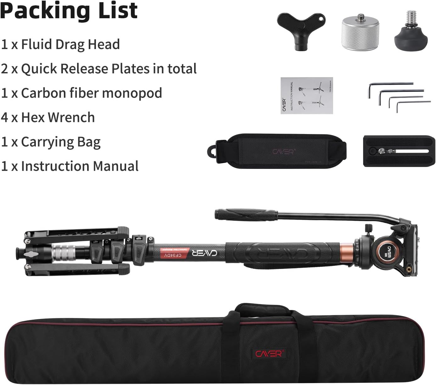 【Includes】Carbon fiber monopod, fluid head, mini tripod base, carrying bag, an extra plate. Max load 13.2lb, weight only 4lbs – ideal for sports/event photography