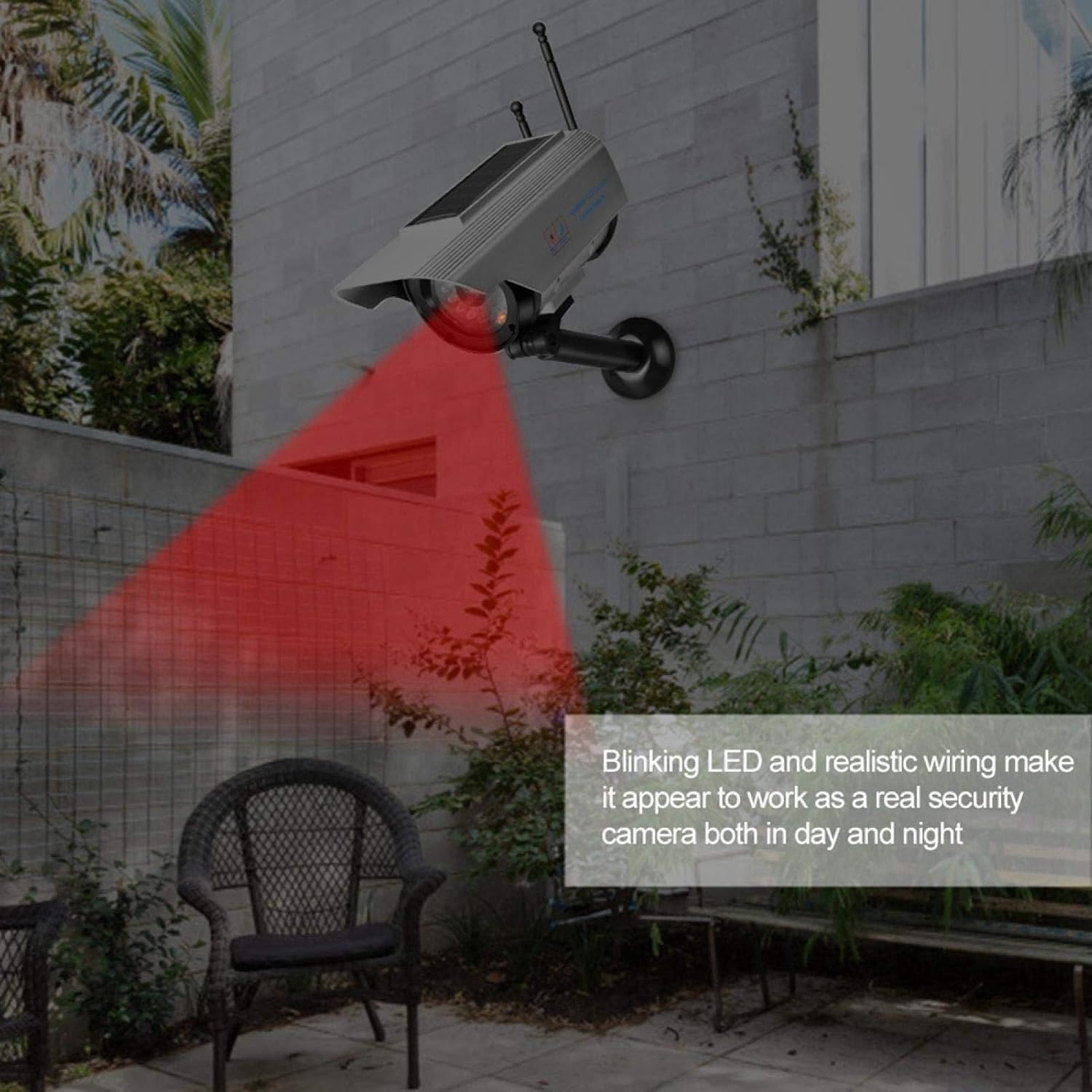 Adjustable bracket , easy and quick to install with mount bracket and screws.Blinking LED and realistic wiring make it appear to work as a real security camera both in day and night.Powered by solar panel or two 2xAAA batteries (Battery is not included).Applicable to supermarkets, hotels, parking lots, libraries, offices, warehouses, bazaars, parks, residential areas, or some conspicuous locations.Installing one or several simulation monitors can be very effective in quenching and deterring thieves or criminals so that they don’t dare to approach.Because our simulation monitors are realistic and workmanship, the working mode is exactly the same as the real monitor. It is difficult to tell that this is a simulation product.