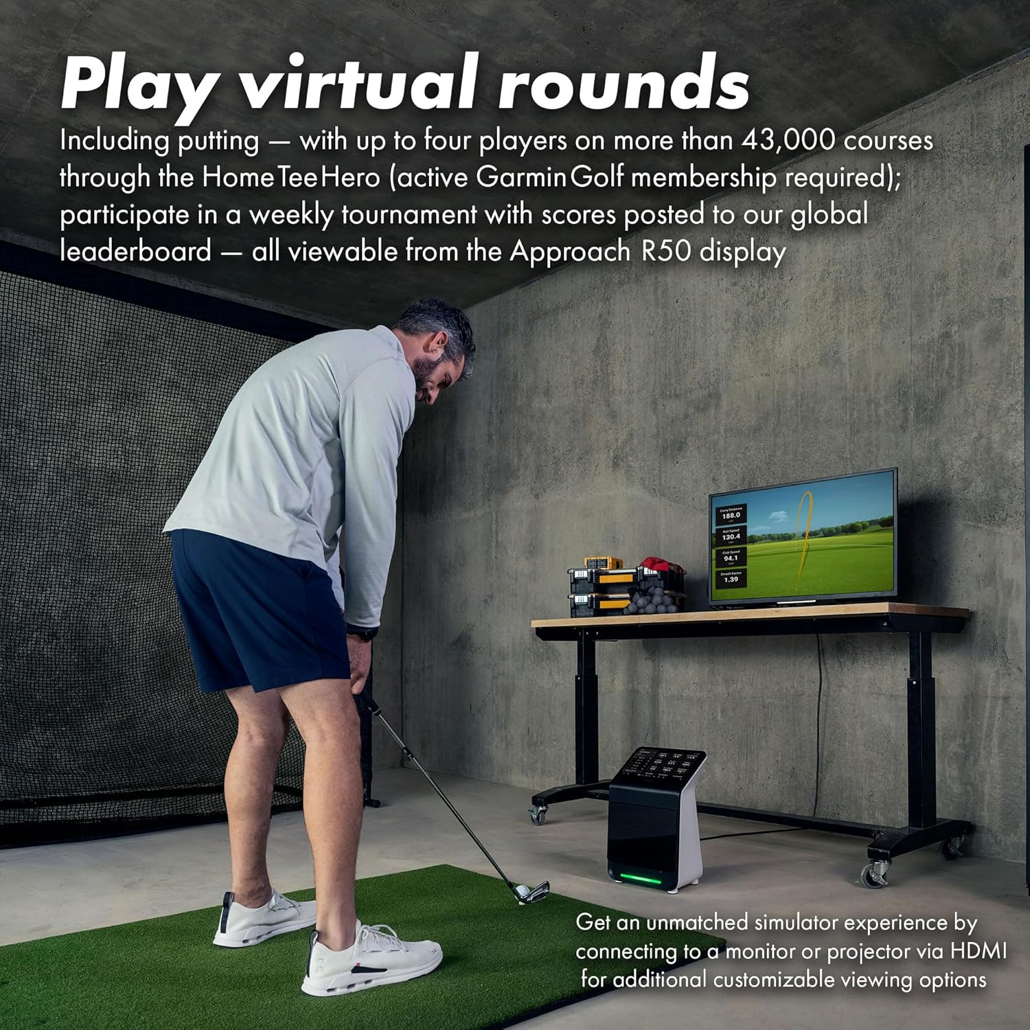 Stay Connected and Compete with Friends and Players Globally: Play with up to four players in virtual rounds, putt included, or join weekly tournaments, sharing your scores on a global leaderboard through the Garmin Approach R50 launch monitor and simulator. With options for HDMI connectivity for larger displays and up to 4 hours of battery life, R 50 seamlessly supports competitive play both indoor at home golf simulator & on the golf course, perfect for who enjoy a dynamic golf experience.