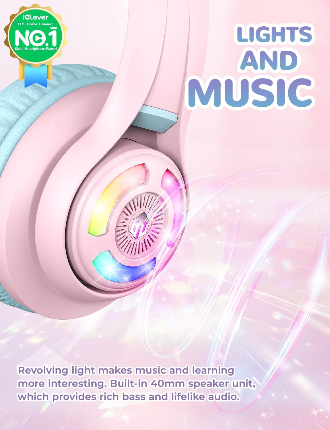 [Cute & Stylish]: It’s the evolution of kids headphones–great sound quality and a cute, fun, kid-friendly design. Your little ones will love the iClever cat ear headphones, whose RGB LED lights are controlled by one independent button. When pressed in Bluetooth mode, it will turn off the lights to extend use time.