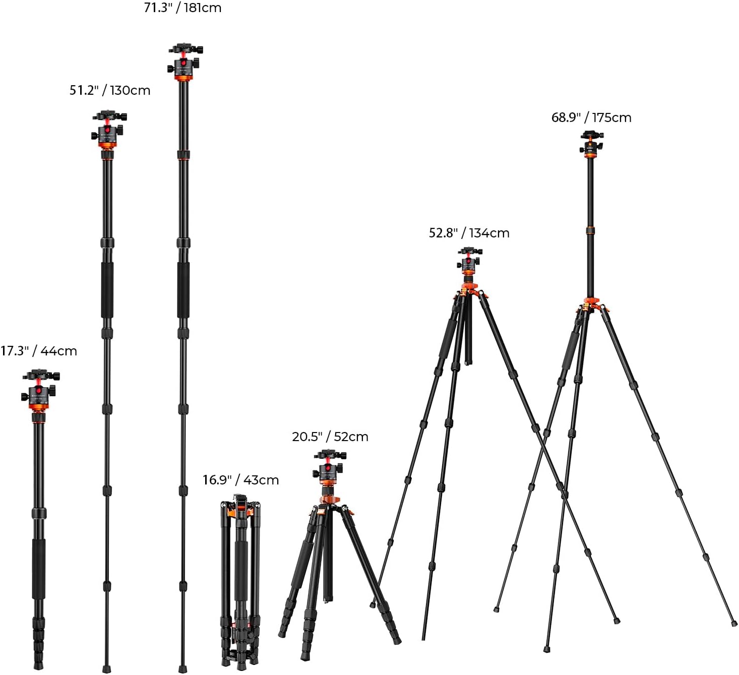 【Compact & Portable】 Quality military magnesium aluminum alloy,corrosion resistance; tripod with ball head weighs only 3.30 lbs/1.5kg, it can be 180°reflexed and folded to 16.9”, easy to put it in a backpack or suitcase when travel.