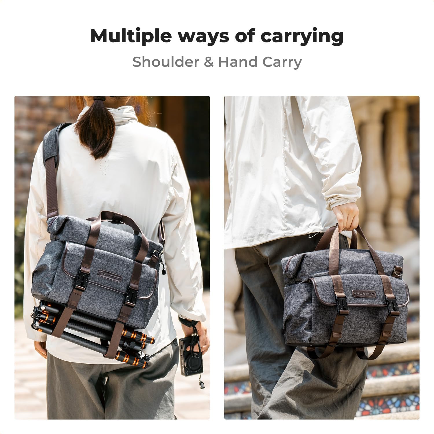 【Multiple Pockets Design】In addition to the main compartment, the exterior of this camera shoulder bag features 1 front zipper pocket for filters, batteries, and other accessories. 2 side pockets for carrying an umbrella or small water bottle. 1 back open pocket for small ipad. Bottom external carry straps allow camera small tripods to be attached to the underside of the bag.