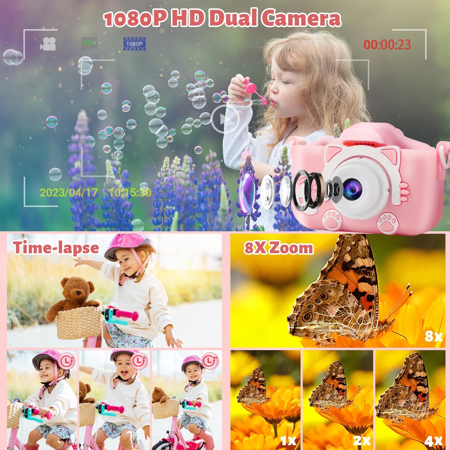 Portable & Lovely Cat Silicon Case: The pink camera with a rope-hanging silicone shell, High quality silicone protects the camera from drops, making the kid camera more durable. Cat mini camera just suitable for the little hands of boys and girls