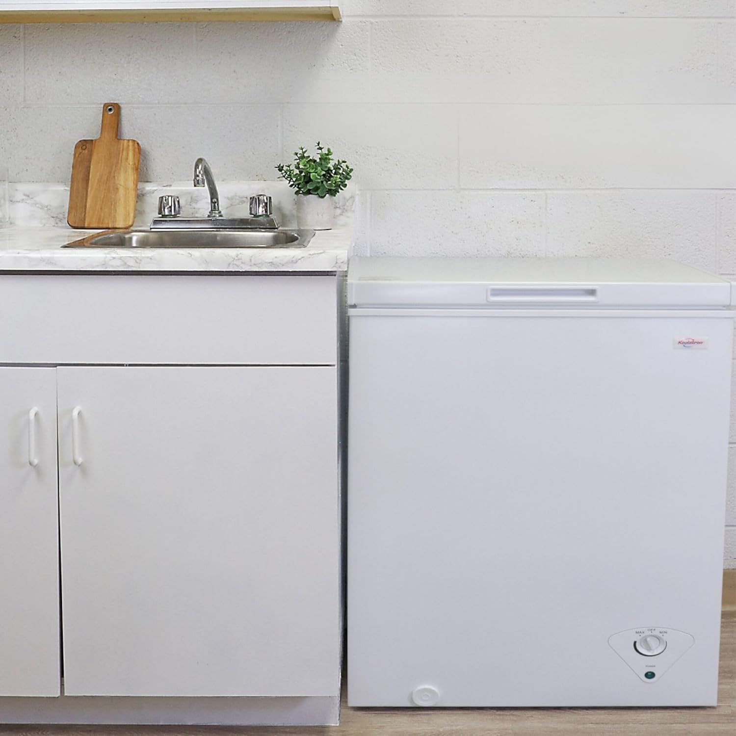 Flat back, narrow footprint, and enclosed evaporator coils let this spacious deep freezer fit neatly right where you need it