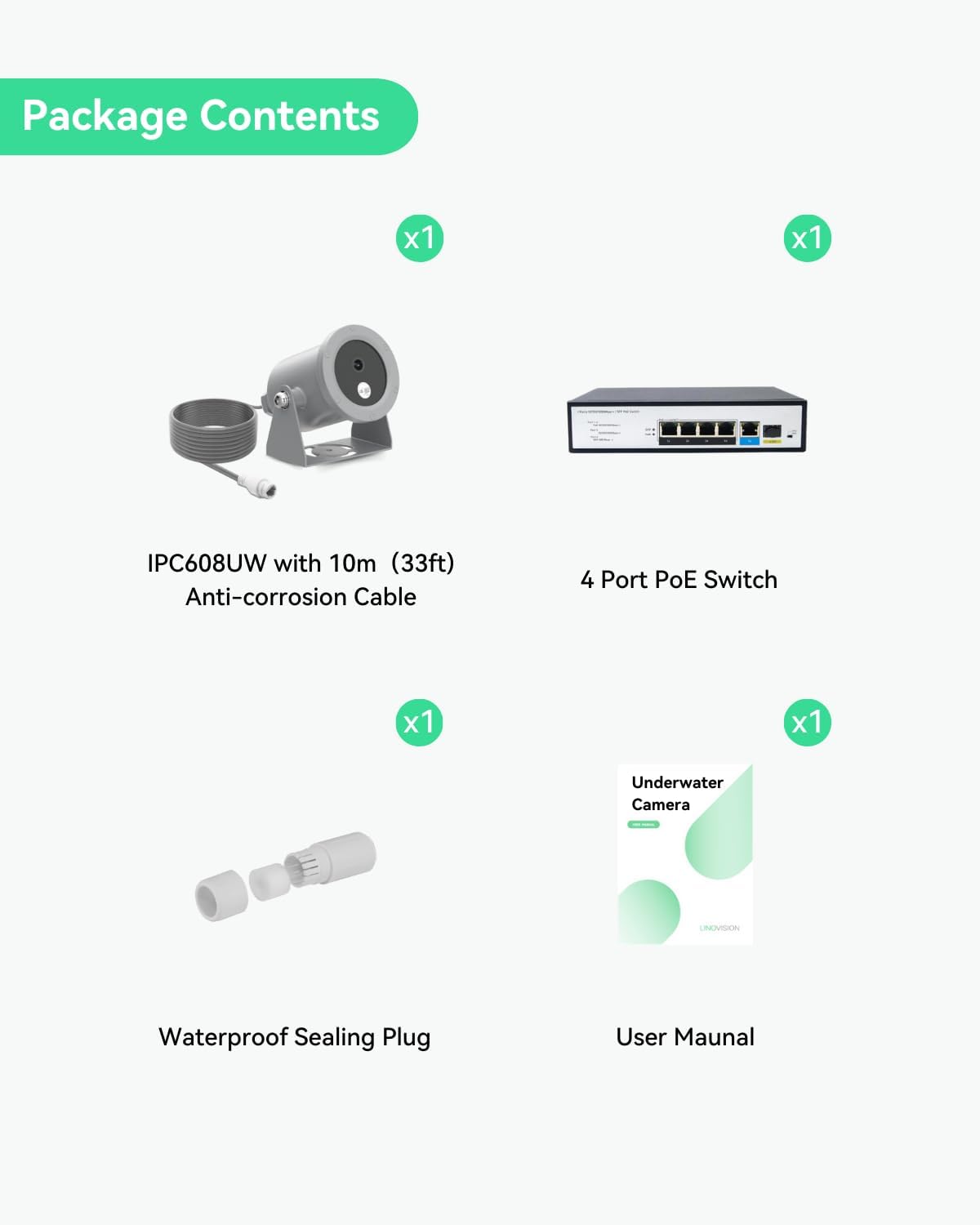 Package Contents – Includes (1) 4K Underwater Camera with 33ft (10m) Anti-corrosion cable, (1) 4 Port POE Switch, (1) Waterproof Sealing Plug, (1) User Manual.