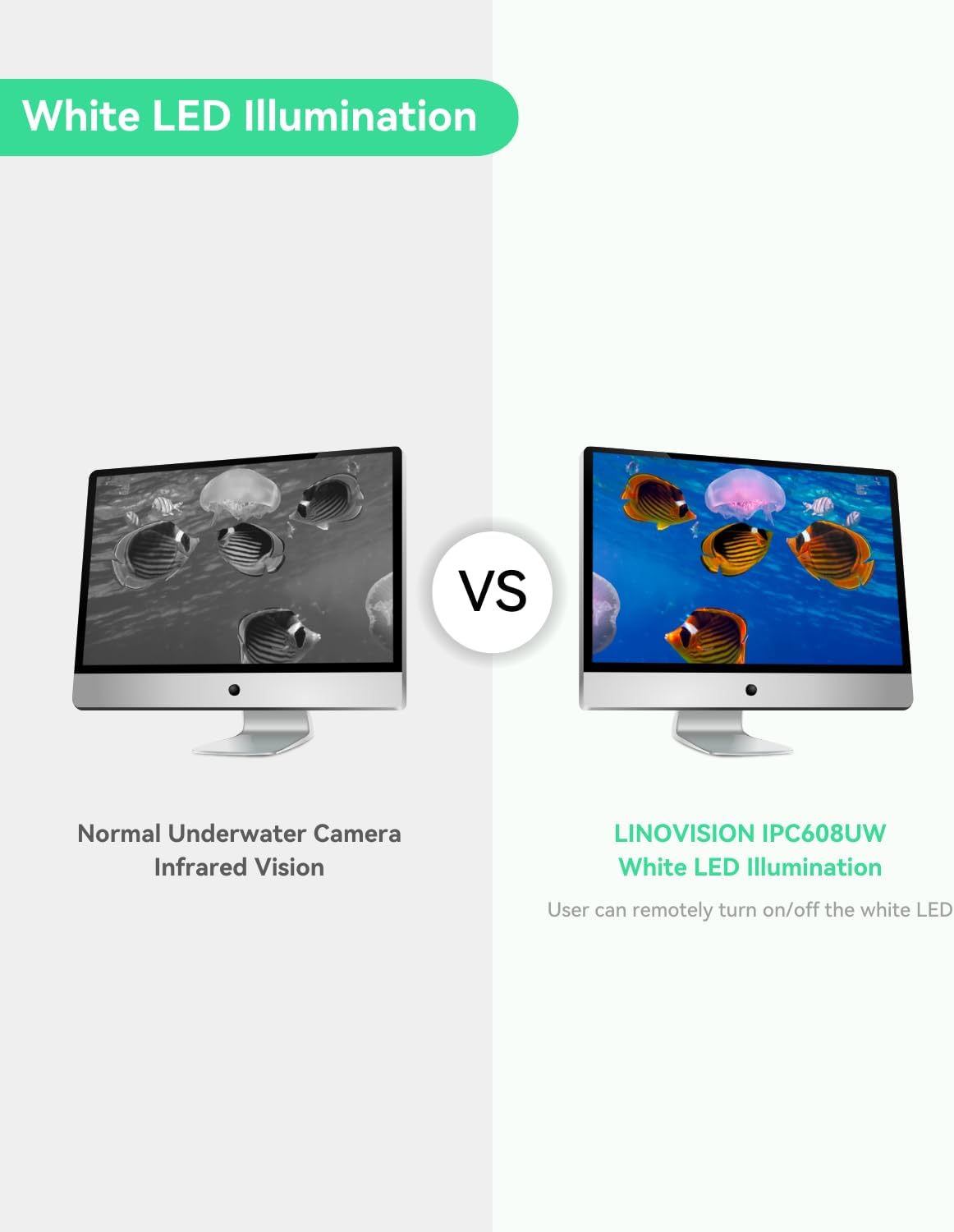 WHITE LIGHT ILLUMINATION – Equipped with white LED for supplement illumination under the waters; Remote On/Off control.