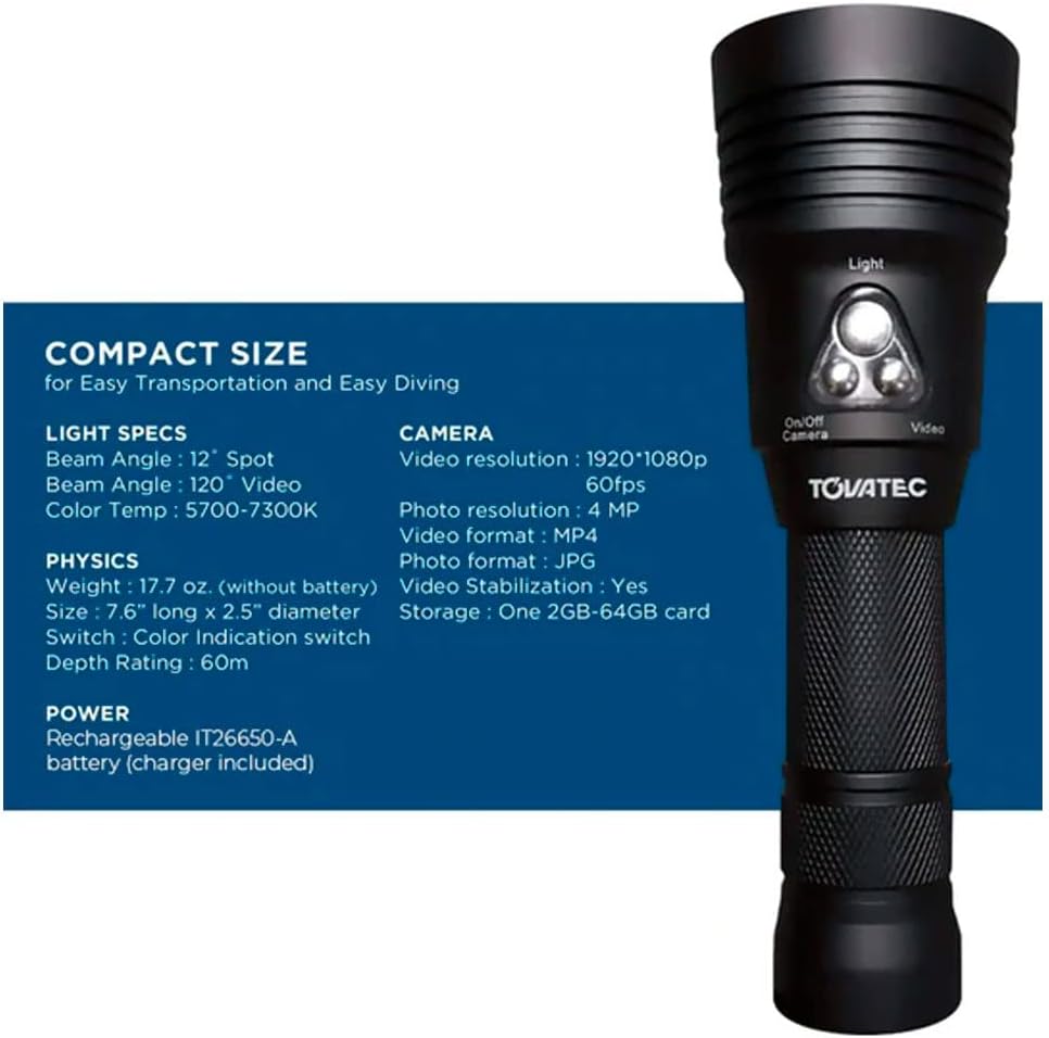 Taking photographs and video underwater can capture a lasting memory. It can also be complicated. Not only do you have to buy camera, light, trays and arms, but those items are bulky, difficult to align, and hard to maneuver around both above and below water. Not to mention that it can be difficult to enjoy a dive with both hands operating a camera. Say goodbye to complications and difficulties Ovate has combined a proprietary, 1080P high-definition camera and light into a single unit. They have engineered the camera and light to work seamlessly to take simple and beautiful photographs and videos underwater. When cruising the Reef, Wreck or Cave use the 1000 lumen primary light that will provide 2.5-Hours of burn time on high or 6-hours on low. When you find an interesting subject switch to the second 1000 lumens video light for filming with the proprietary high-definition camera allowing 1.5-Hours of video or 8-hours without the light. When using camera for snapshots batteries will provide 10, 000+ pictures with light on. All This is achieved with the 3-buttons allowing simple one-handed operation of both lights and camera. Here’s how it works: press button to turn light on/off. Press button to take still photo. Press button to start or stop video. Clear area of switch system glows Blue when camera is turned on, quickly flashes red when picture is taken and has a slow on/off Red glow when recording video. The primary 1000 lumen mode has a beam angle of 12
