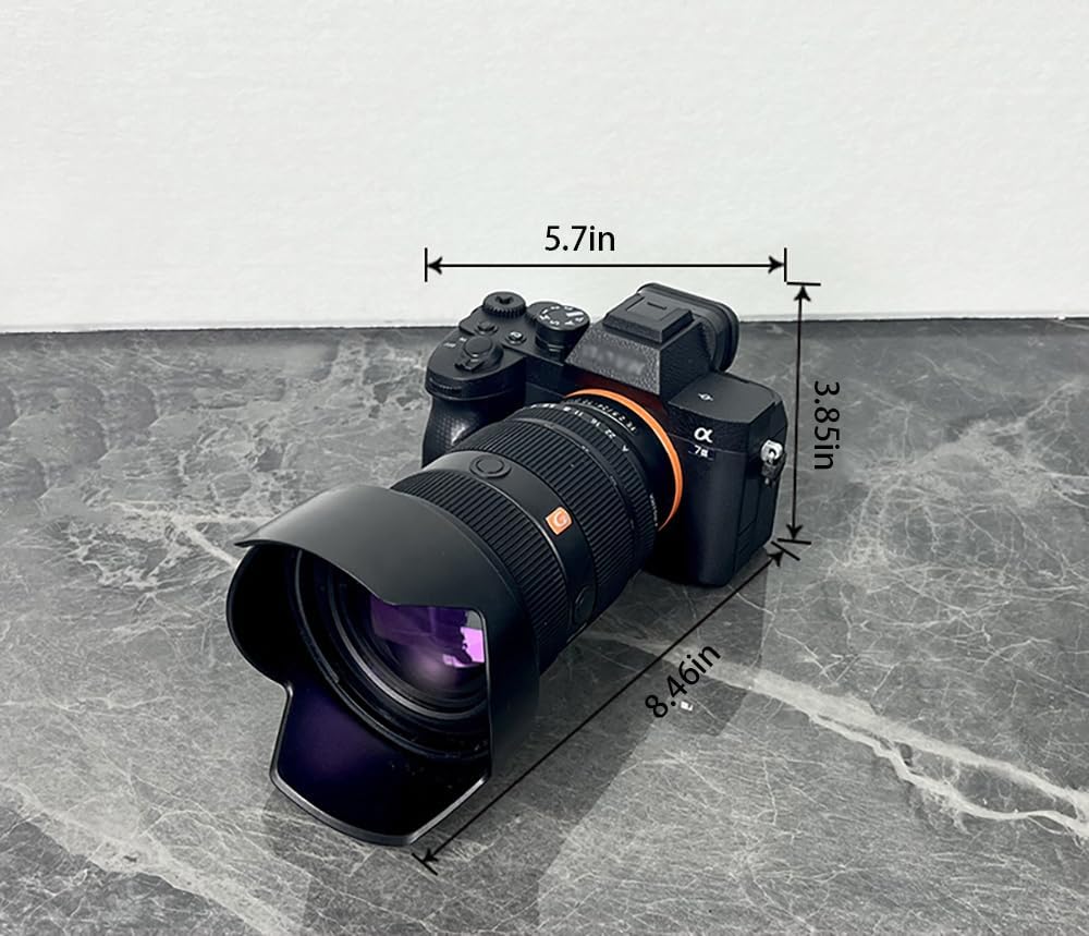 Length 8.46in, width 5.7in, height 3.85in, weight 23.63oz, lens is black