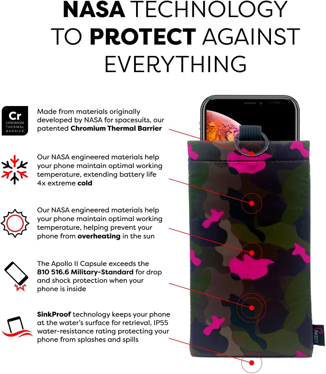 NASA TECH FOR YOUR PHONE: Leveraging spacesuit technology, PHOOZY’s thermal phone pouch with patented Chromium Thermal Barrier is the perfect insulating cell phone case for hot weather, reflecting more than 90% of the heat from the sun and acting as your personal phone heat protector. (Not designed to be left in a hot car for long periods. The PHOOZY insulated cell phone case is not a cell phone cooling case, meaning it does not cool down a hot phone. It helps prevent overheating in the sun by reflecting solar radiation).