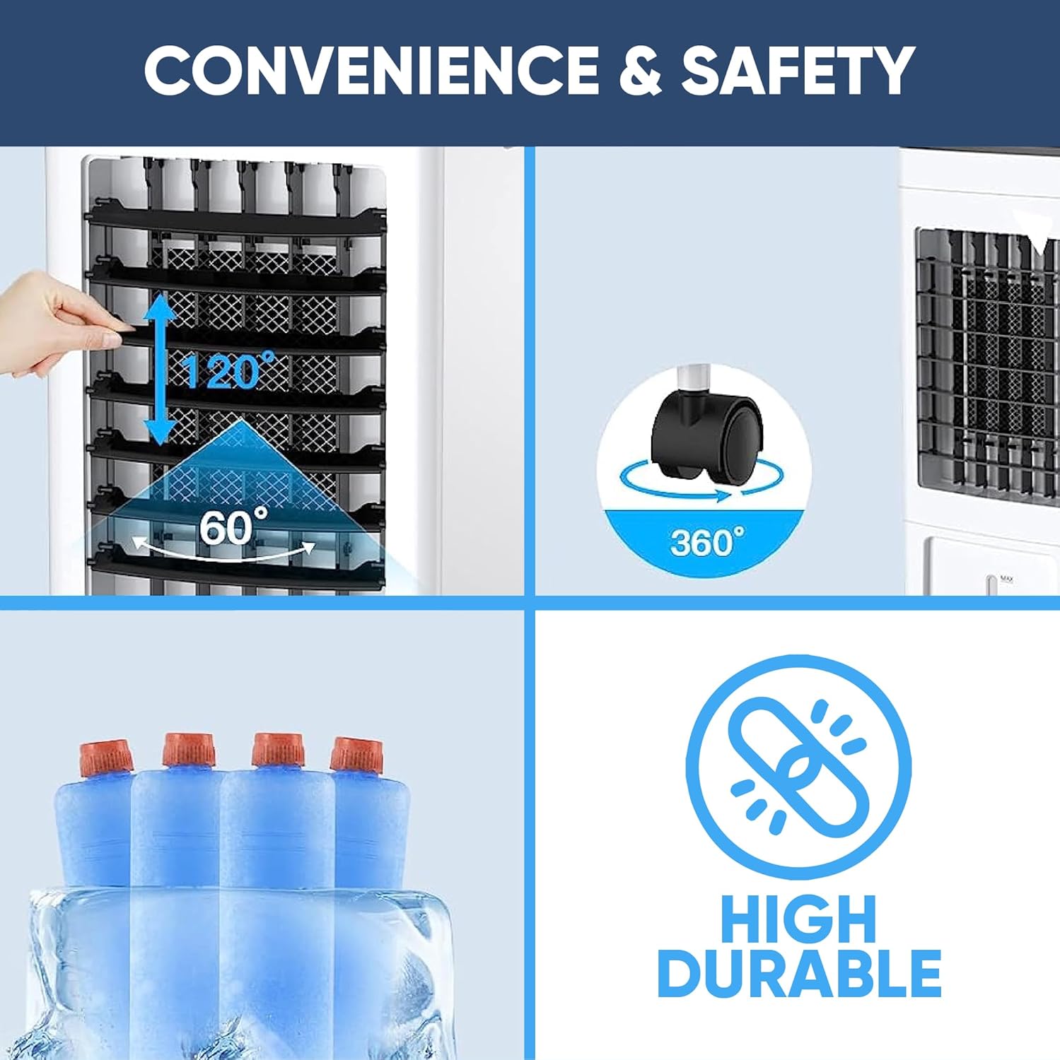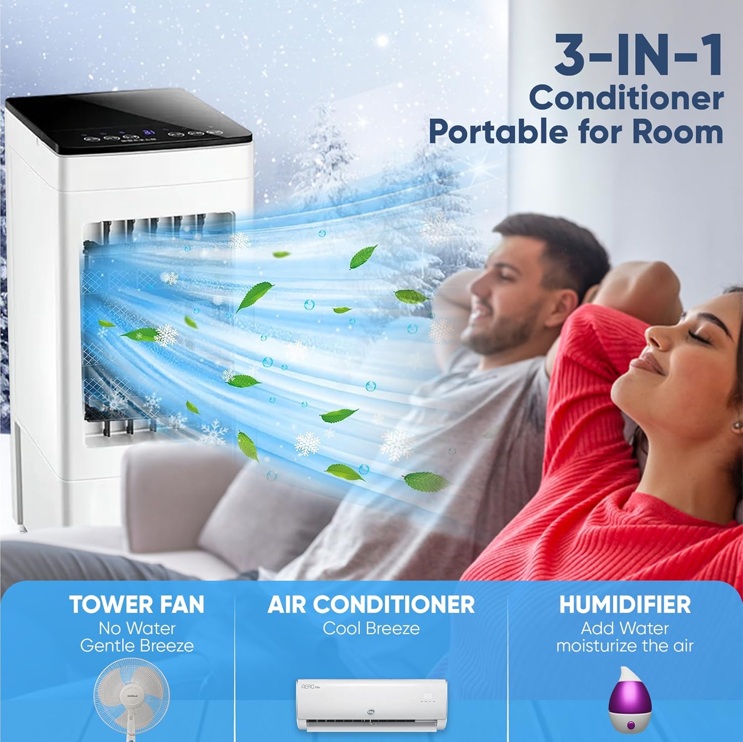 【3-in-1 Advanced Air Cooler】Our multifunctional portable air conditioner offers three essential functions in one compact device: it works as a fan when water is not added, an air humidifier for improving air moisture in dry surroundings, and as a indoor room air conditioners when used with the included 4 reusable ice packs, ensuring continuous and efficient cooling.