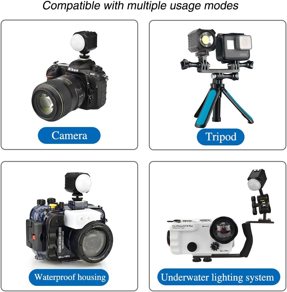 【Installing Compatibility】:Including 1/4″-20 ball head and cold shoe adapter, this portable underwater light can be installed on camera, waterproof camere/phone case, underwater photographic lighting bracket, tripod, etc., which can meet various needs.