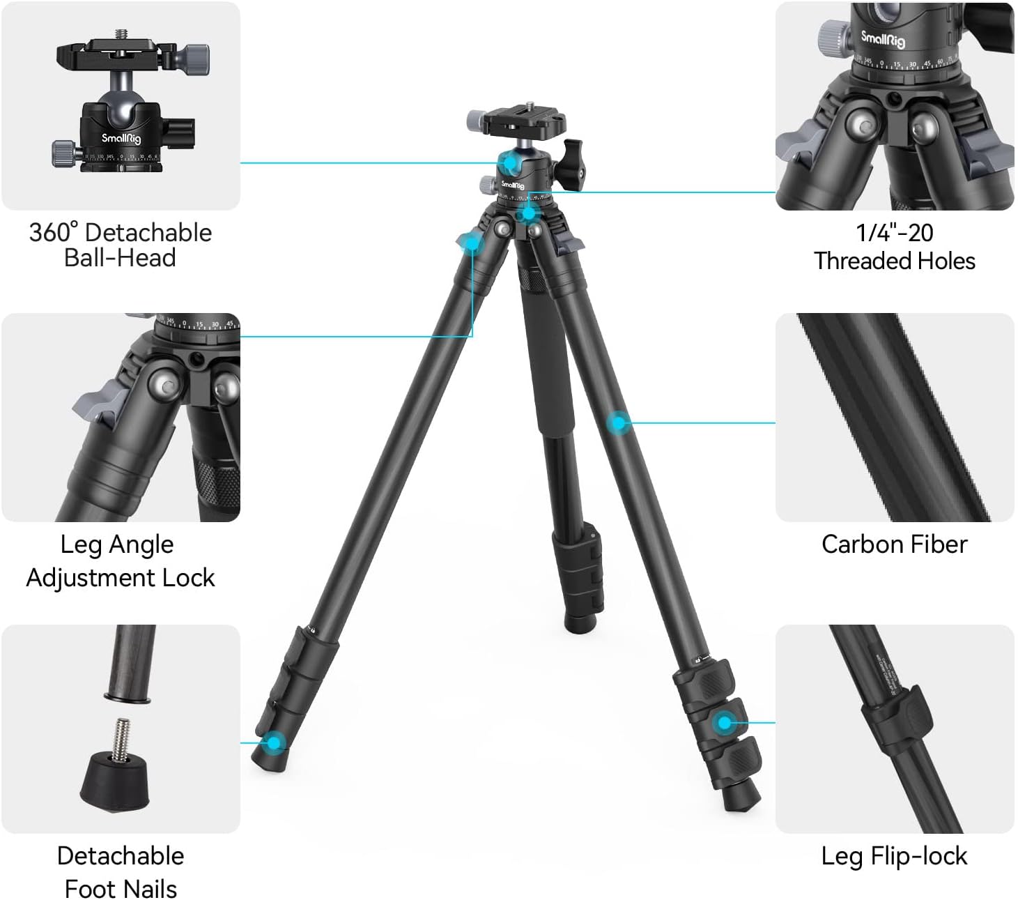 【Innovation & Package Includes】Different from other tripods, this travel tripod has three 1/4″ threaded holes added to the bracket, allowing you to easily attach external magic arms, mobile phones, monitors, and other accessories. Package Include : SmallRig Carbon Fiber Tripod x 1, storage package x 1, user manual x 1.