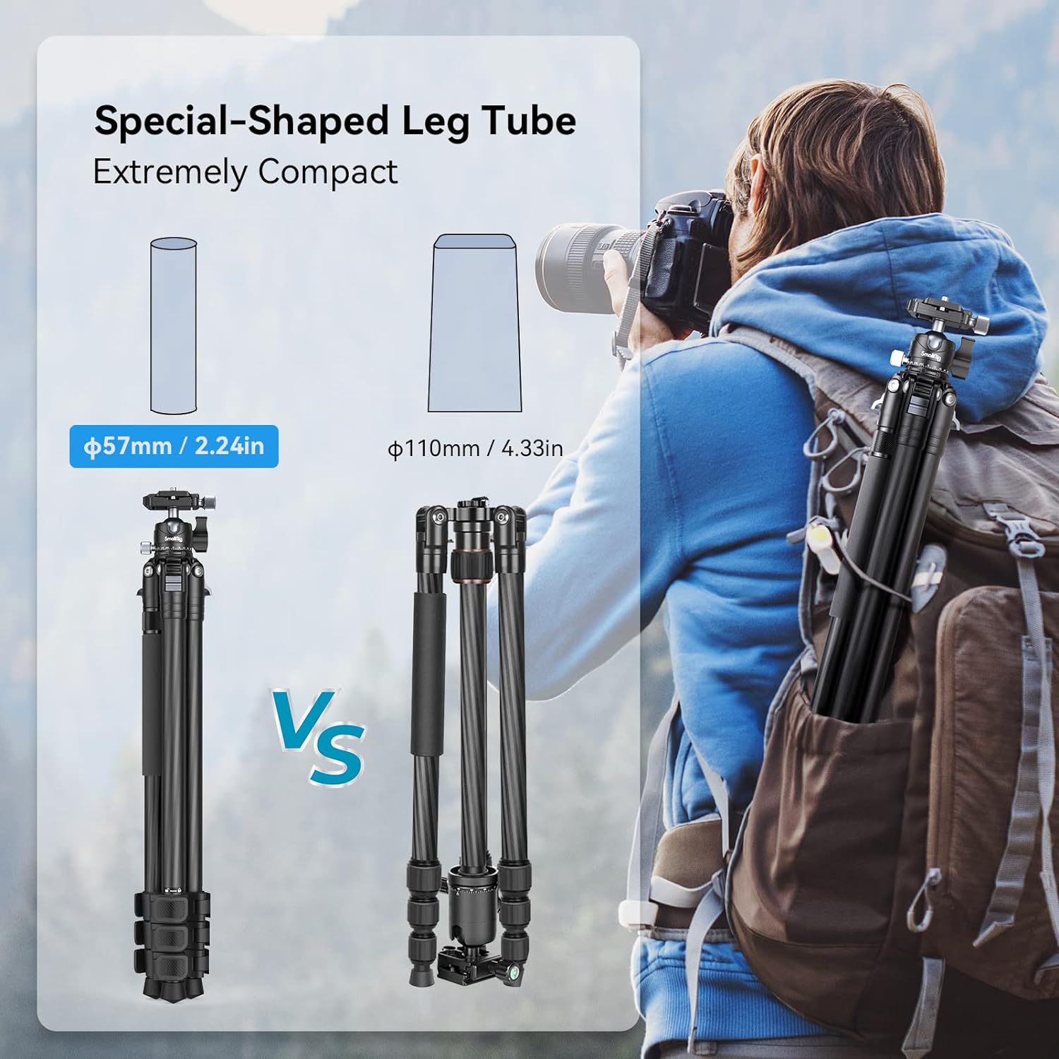 【Ultra-Compact Design】The lightweight design of this portable camera tripod makes it achieves the most compact storage volume. It folds down to just 21.3 inches (only 2.24 in/57 mm in diameter) and weighs only 2.6 lbs, making it perfect for travel and outdoor photography with a Included bag.【Note】Center column is not included.