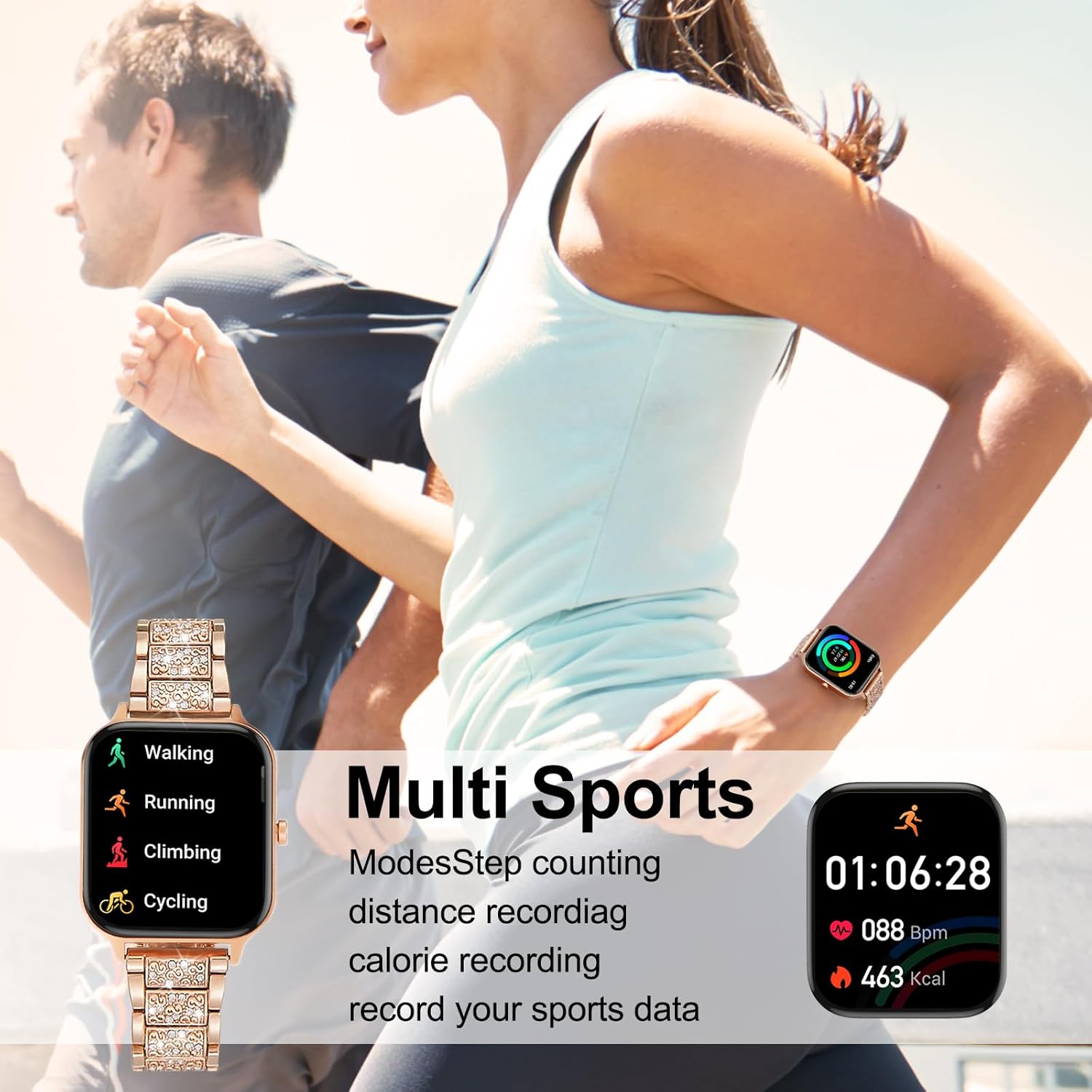 SCREEN & CUSTOM WATCH DIALS: Ultra-thin metal frame with full touch screen brings comfortable touch and excellent visual experience. There are 150+ free dials within the app for you to choose from, you can also customize your watch faces with your favorite picture such as your family, pet, etc. Comes with 3 bands, the stainless steel diamond band is more fashionable, the pink silicone band and pink leather band is more casual and sporty. It’s the best gift for your friends.