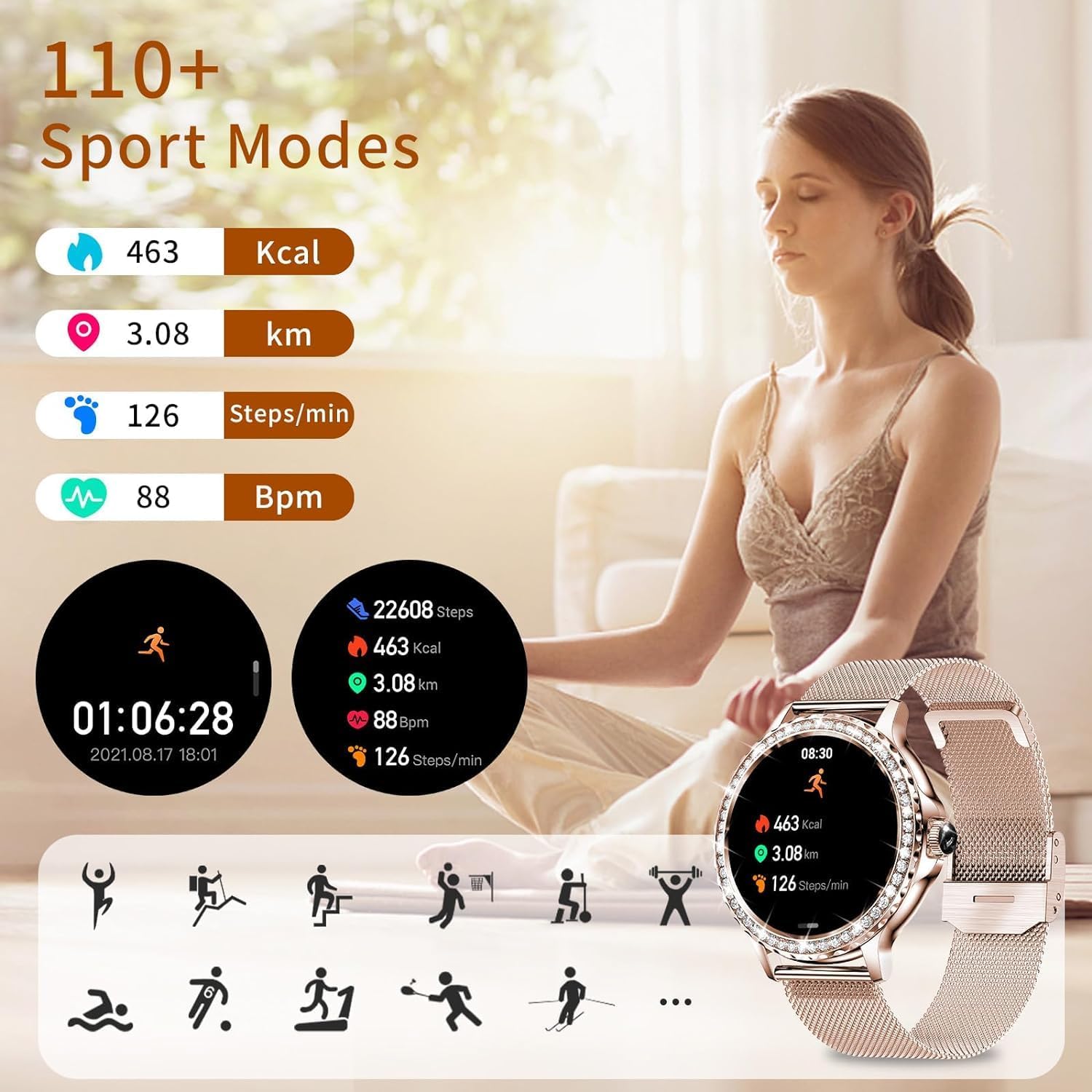 🤾♀️Activity Tracker &100+Sport Modes – The fitness smartwatches for women supports more than 100+sport modes (walking, running, hiking, yoga, cycling, basketball, etc.), automatically monitors and records the daily steps in real time, calculates the exercise time and calories burned, helps you to build a good exercise habit, more active lifestyle
