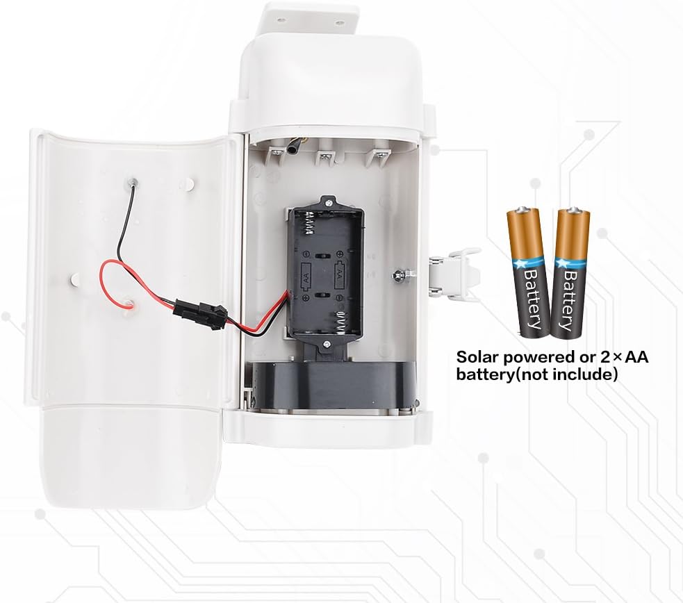 ☛ Flashing Led: Blinking red LED powered by solar or 2pcs AA batteries saves more power and makes sure it is able to work normally on a cloudy or raining day. Have everyone believes your house is monitored 24/7 continuously.