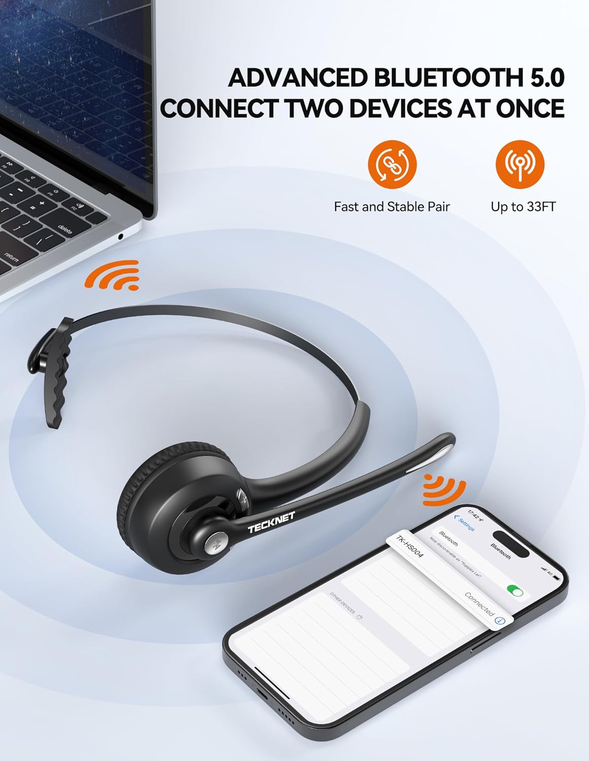 TECKNET Wireless headset adopts 5.2 Bluetooth technology to ensure stable and fast connection