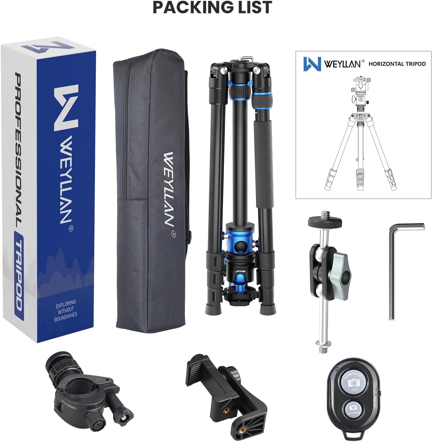 【Wide Application】WEYLLAN TP6 tripod stand is made of premium aluminum alloy, tripod net weight of 3.53lbs/1.6kg and max load 22lbs/10kg. Come with 36mm ball head, phone holder mount, tube clamp, magic arm and remote control, suitable for camera, iPhone series and Android cell phones shooting and selfies. The tripod body is designed with a 1/4” threaded hole for mounting auxiliary shooting equipment accessories.