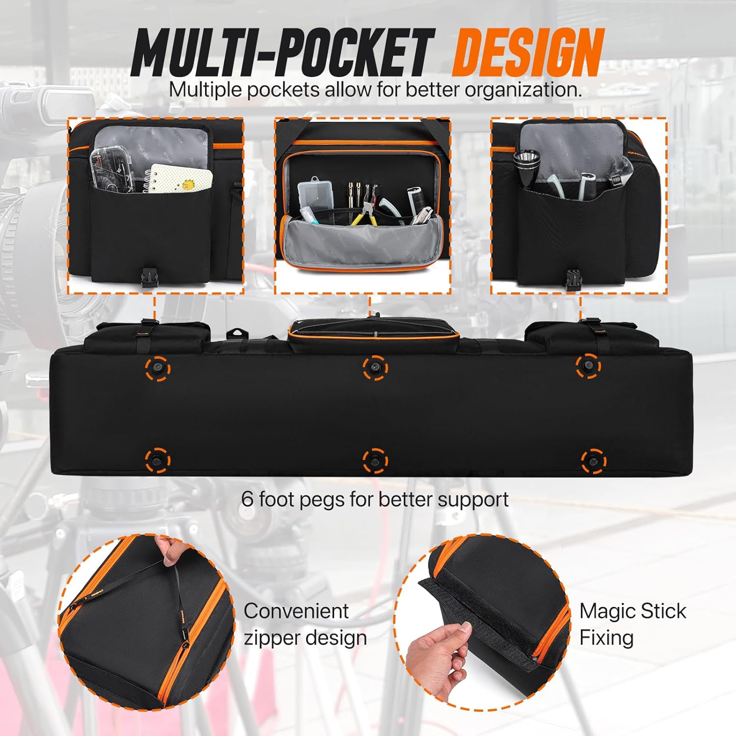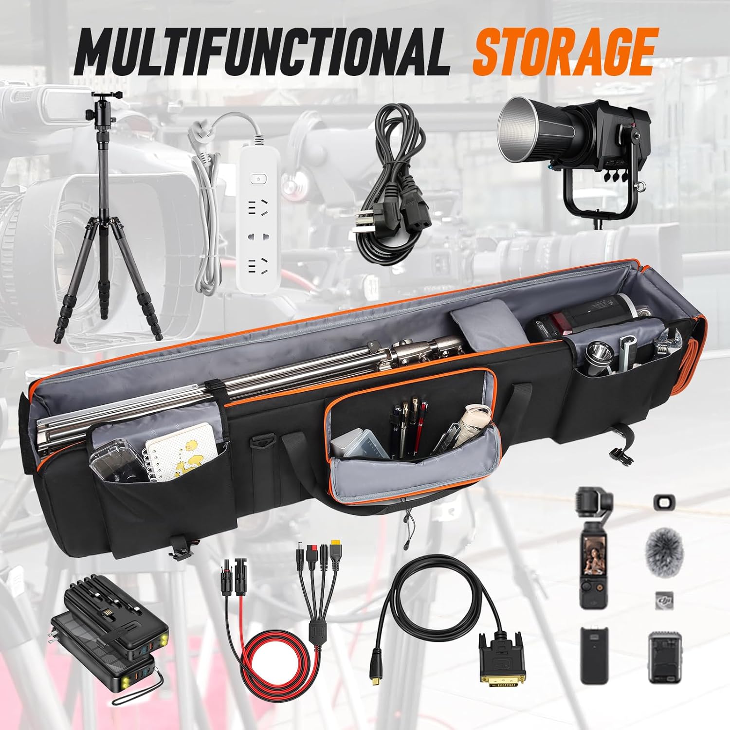 Large space: Tripod Carrying Case Upgrade to a larger size50*9.6*9.8in, can effectively hold multiple equipment. The main compartment is compatible with light stands, boom stand, umbrellas, monolights, LED lights, flashes, gimbals, and other photographic equipment and accessories