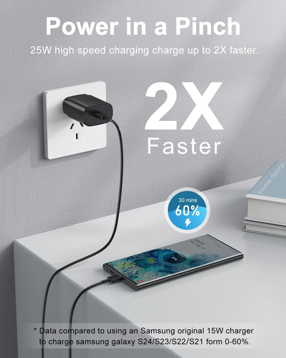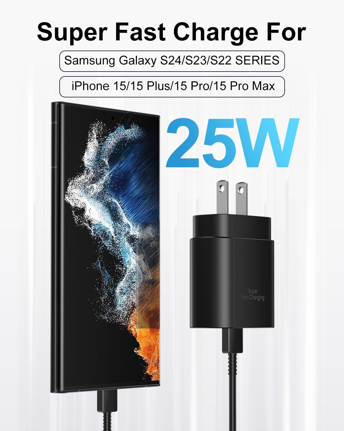 【5X Fast Charging】:The 25W USB-C port PD super fast adapter wall charger and 6FT usb c to usb c fast charging cords,That is,it will charge your Galaxy S24/iPhone 15 up to 60% power in just 30 minutes,and only takes 1 hours to charge your Galaxy S24/iPhone 15 fully to save 2hrs more time for you!