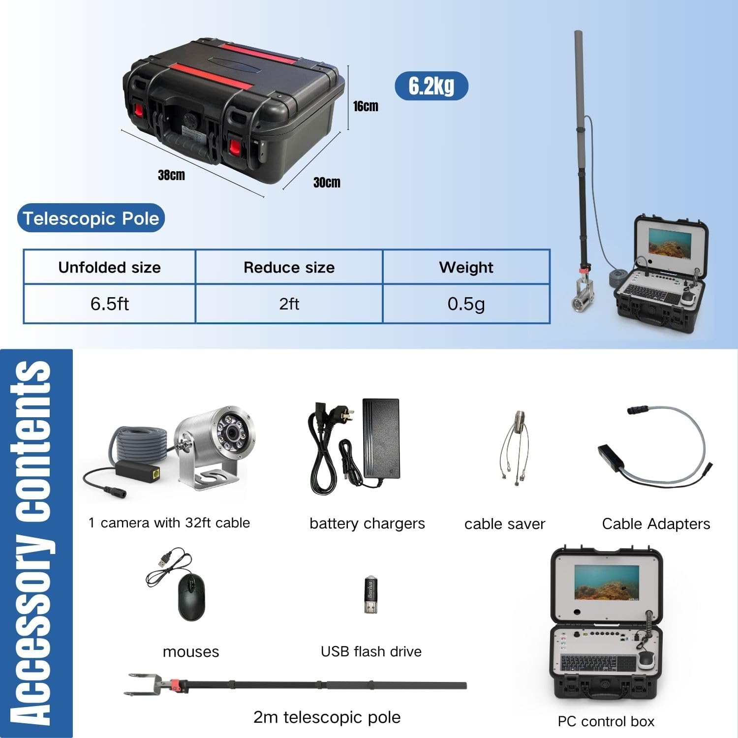 Flexible mobility: Equipped with a 2m aluminum telescopic pole, the camera can be easily maneuvered for detailed inspection of boat bottoms, bridge piers and other underwater structures. It can also be used directly in the water with a 32ft cable