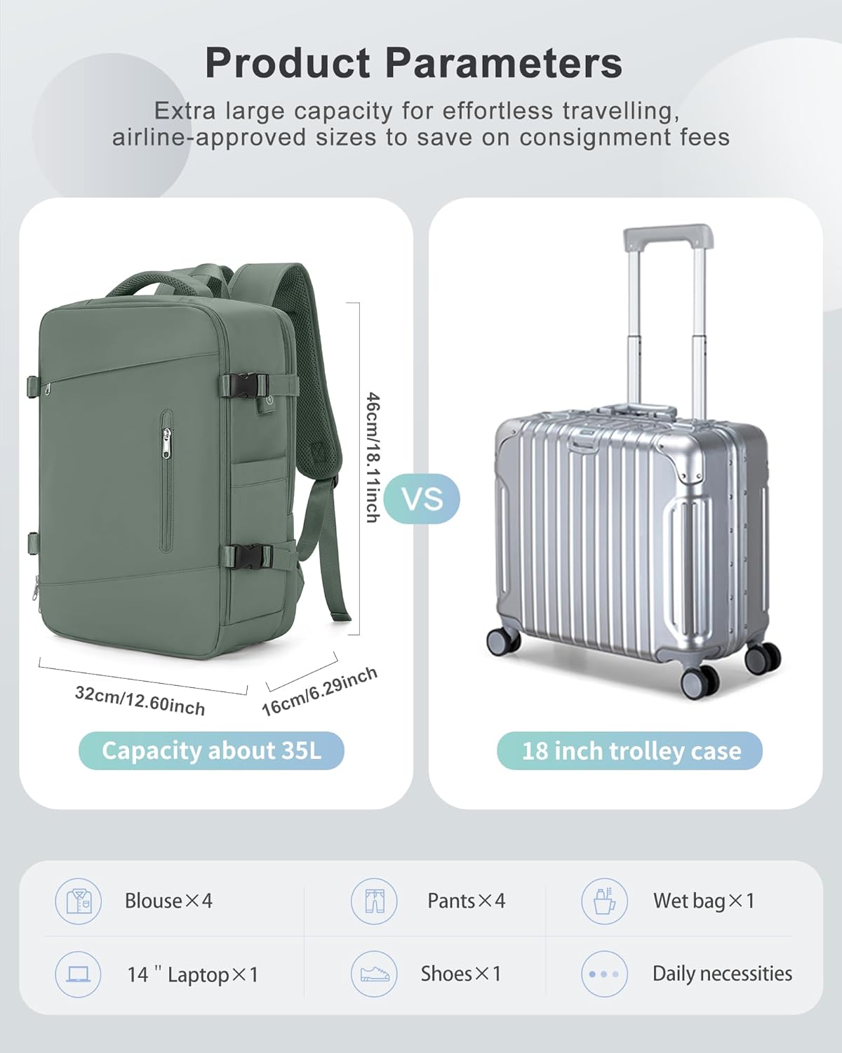 Carry on Backpack For Women: The size of the backpack is 13*6.3*18.1 (inch). It is an airline-approved women’s travel backpack that can be carried on airplanes, saving a fortune in check-in fees. Perfect for traveling and business trips under your airplane seat.