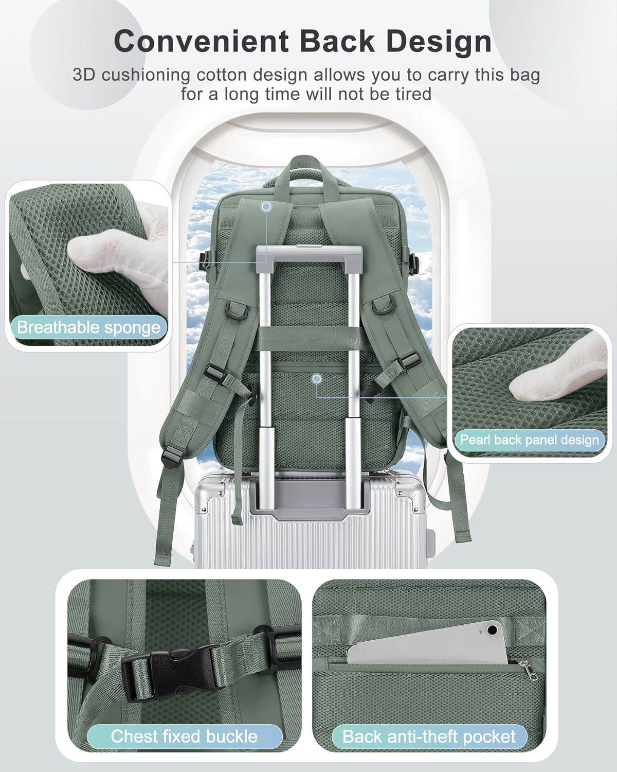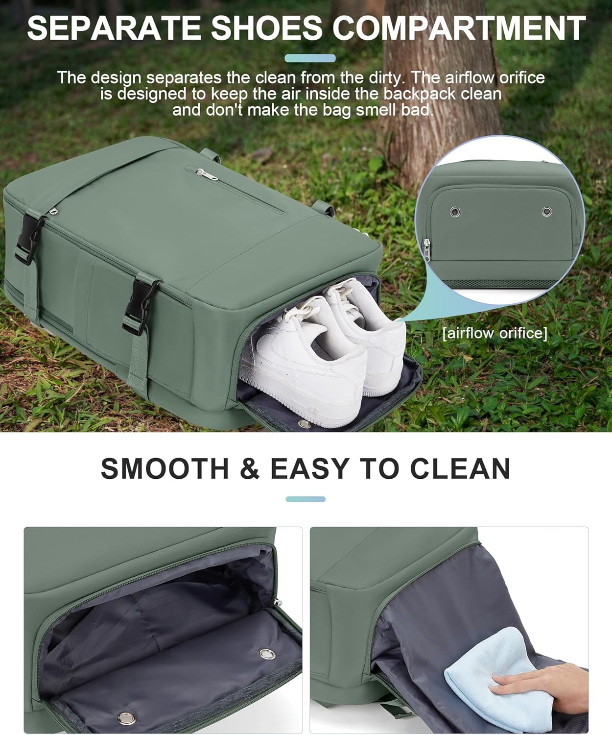 Large Capacity Travel Backpack: Two main pockets keep your belongings organized and easier to find for women’s personal items, clothing, and more. Two laptop compartments for a 13-inch iPad and a 15.6-inch laptop. The casual backpack is also designed with a waterproof wet bag which is made of high-density waterproof material to help you separate wet and dry items and a separate shoes compartment which can help you carry your shoes better.