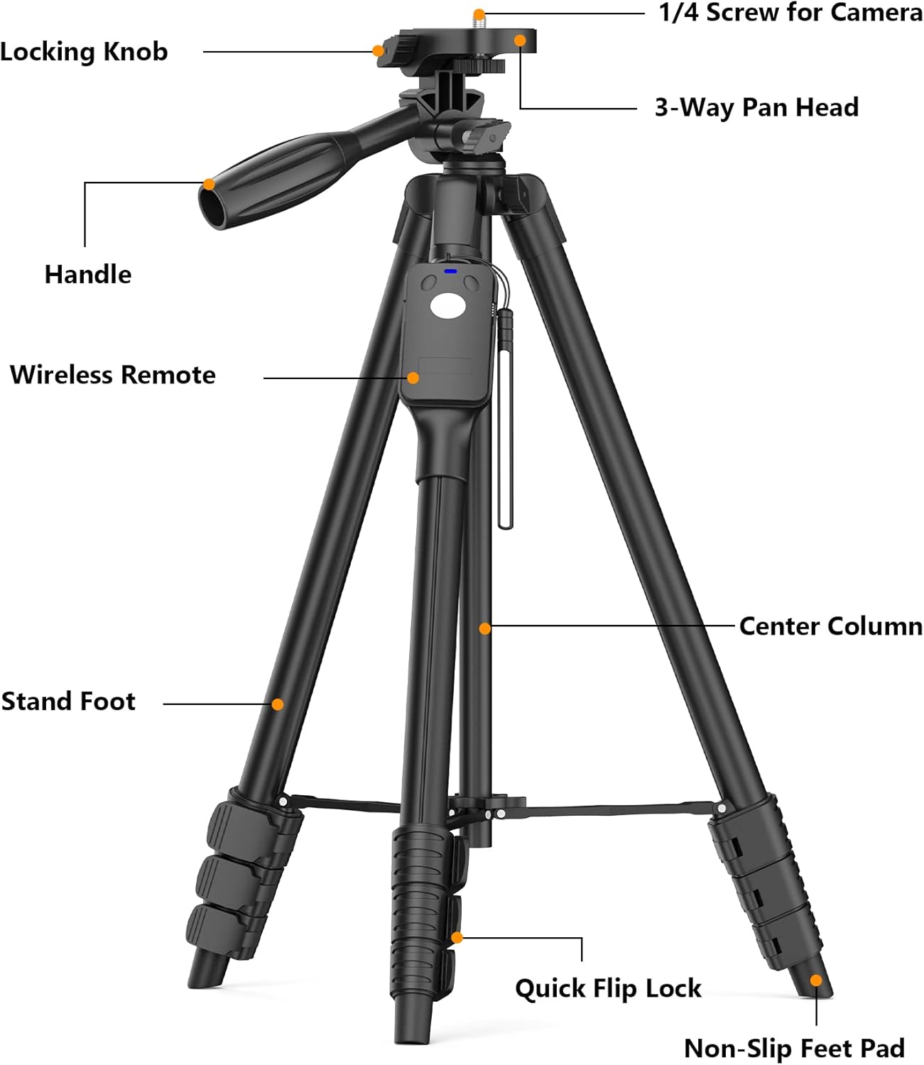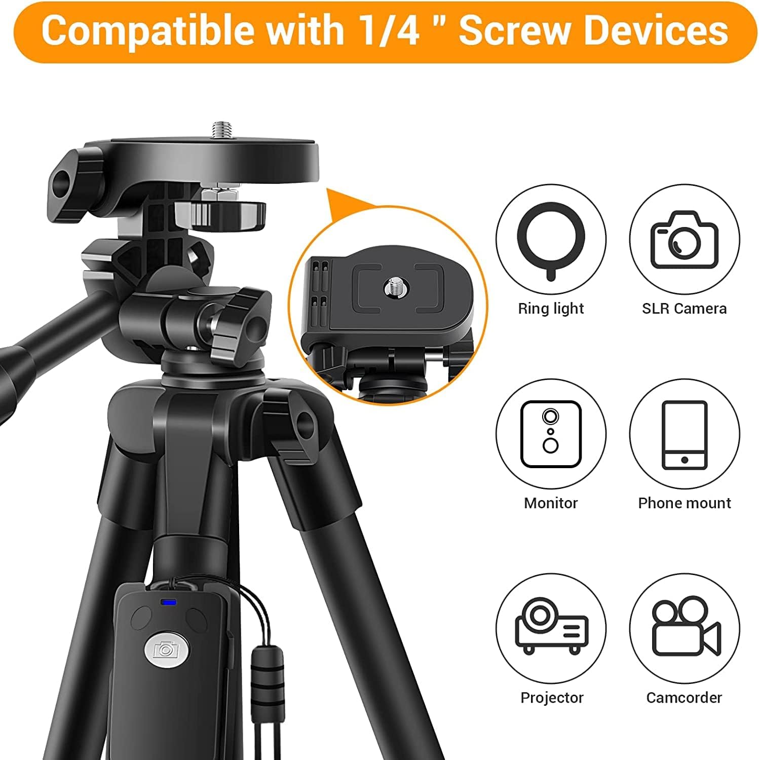 【Extendable Tripods】Extends from 20 to 60in with 5-section aluminum alloy telescopic rod, this camera tripod fully adapts to a range of different heights with the locking-pad locked, and enables you to create your own unique height and view while taking a picture or video. Note: When excluding the phone mount, the maximum height of the tripod body is 55.5 inches.